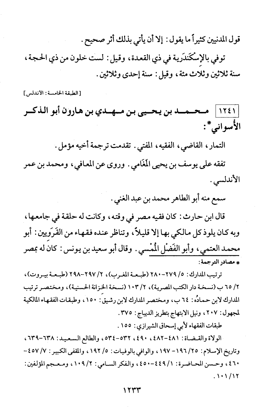 * مصادر الترجمة: ترتيب المدارك: 5/ 279 - 280 (طبعة المغرب)، 2/ 297 - 298 (طبعة بيروت)، 2/ 65 ب (نسخة دار الكتب المصرية)، 2/ 103 (نسخة الخزانة الحسنية)، ومختصر ترتيب المدارك لابن حماده: 64 ب، ومختصر المدارك لابن رشيق: 150، وطبقات الفقهاء المالكية لمجهول: 207، ونيل الابتهاج بتطريز الديباج: 375. طبقات الفقهاء لأبي إسحاق الشيرازي: 155. الولاة والقضاة: 481 - 482، 490، 532 - 534، والطالع السعيد: 638 - 639، وتاريخ الإسلام: 25/ 196 - 197، والوافي بالوفيات: 5/ 192، والمقفى الكبير: 7/ 457 - 460، وحسن المحاضرة: 1/ 449 - 450، والفكر السامي: 2/ 109، ومعجم المؤلفين: 12/ 101.