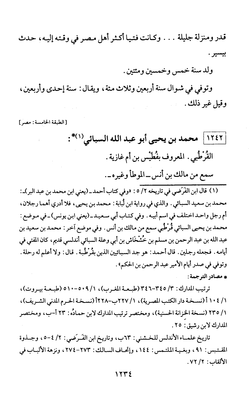 (¬1) قال ابن الفرضي في تاريخه 2/ 5: «وفي كتاب أحمد - (يعني ابن محمد بن عبد البر) -: محمد بن سعيد السبائي. والذي في رواية ابن لبابة: محمد بن يحيى، فلا أدري أهما رجلان، أم رجل واحد اختلف في اسم أبيه. وفي كتاب أبي سعيد - (يعني ابن يونس) - في موضع: محمد بن يحيى السبائي قرطبي سمع من مالك بن أنس. وفي موضع آخر: محمد بن سعيد بن عبد الله بن عبد الرحمن بن مسلم بن خشخاش بن أبي وعلة السبائي أندلسي قديم، كان المفتي في أيامه. فجعله رجلين. قال أحمد: هو جد السبائيين الذين بقرطبة. قال: ولا أعلم له رحلة. وتوفي في صدر أيام الأمير عبد الرحمن بن الحكم».