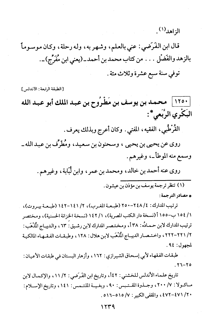 * مصادر الترجمة: ترتيب المدارك: 4/ 248 - 250 (طبعة المغرب)، 2/ 141 - 142 (طبعة بيروت)، 1/ 154 ب - 155 أ (نسخة دار الكتب المصرية)، 1/ 142 (نسخة الخزانة الحسنية)، ومختصر ترتيب المدارك لابن حماده: 38 أ، ومختصر المدارك لابن رشيق: 63، والديباج المذهب: 2/ 221 - 222، واختصار الديباج المذهب لابن هلال: 128، وطبقات الفقهاء المالكية لمجهول: 94. طبقات الفقهاء لأبي إسحاق الشيرازي: 162، وأزهار البستان في طبقات الأعيان: 25 - 26. تاريخ علماء الأندلس للخشني: 42 أ، وتاريخ ابن الفرضي: 2/ 11، والإكمال لابن ماكولا: 7/ 200، وجذوة المقتبس: 90، وبغية الملتمس: 141، وتاريخ الإسلام: 20/ 471 - 472، والمقفى الكبير: 7/ 515 - 516.
