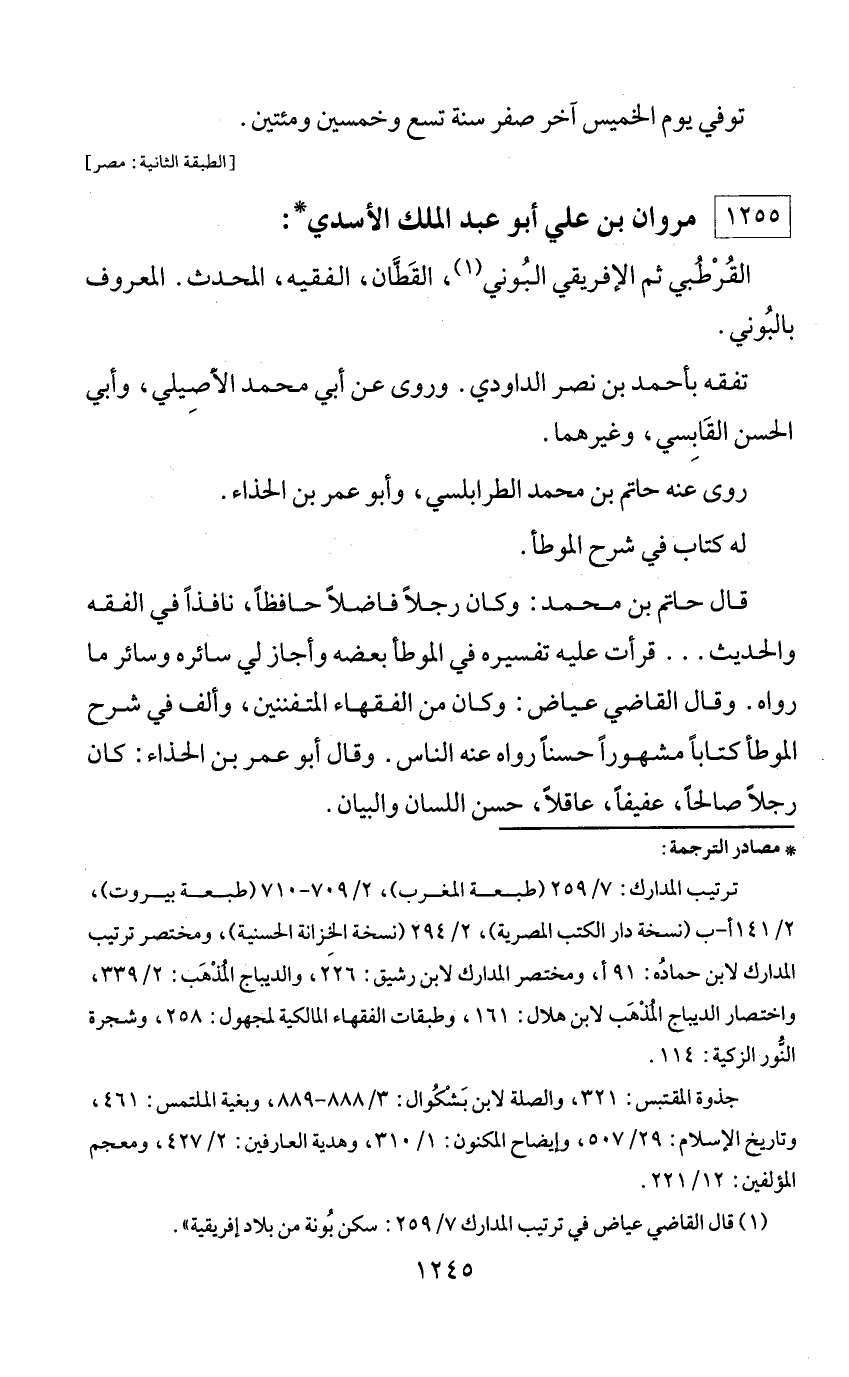 * مصادر الترجمة: ترتيب المدارك: 7/ 259 (طبعة المغرب)، 2/ 709 - 710 (طبعة بيروت)، 2/ 141 أ - ب (نسخة دار الكتب المصرية)، 2/ 294 (نسخة الخزانة الحسنية)، ومختصر ترتيب المدارك لابن حماده: 91 أ، ومختصر المدارك لابن رشيق: 226، والديباج المذهب: 2/ 339، واختصار الديباج المذهب لابن هلال: 161، وطبقات الفقهاء المالكية لمجهول: 258، وشجرة النّور الزكية: 114. جذوة المقتبس: 321، والصلة لابن بشكوال: 3/ 888 - 889، وبغية الملتمس: 461، وتاريخ الإسلام: 29/ 507، وإيضاح المكنون: 1/ 310، وهدية العارفين: 2/ 427، ومعجم المؤلفين: 12/ 221.