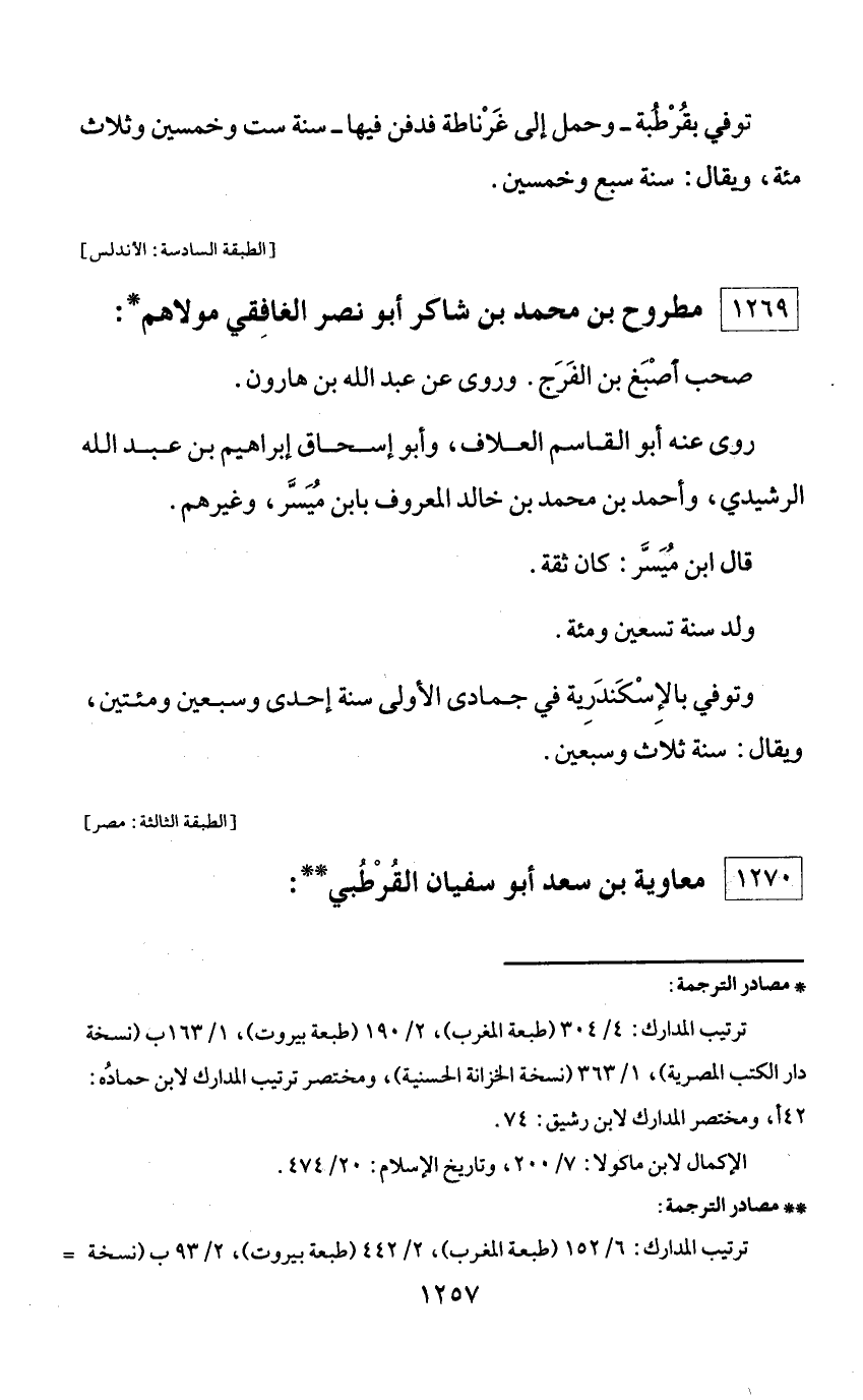 * مصادر الترجمة: ترتيب المدارك: 4/ 304 (طبعة المغرب)، 2/ 190 (طبعة بيروت)، 1/ 163 ب (نسخة دار الكتب المصرية)، 1/ 363 (نسخة الخزانة الحسنية)، ومختصر ترتيب المدارك لابن حماده: 42 أ، ومختصر المدارك لابن رشيق: 74. الإكمال لابن ماكولا: 7/ 200، وتاريخ الإسلام: 20/ 474.