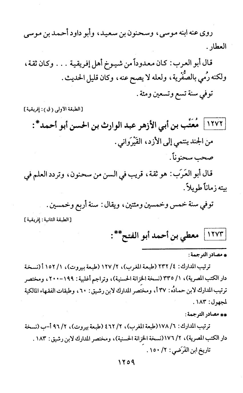 * مصادر الترجمة: ترتيب المدارك: 4/ 232 (طبعة المغرب)، 2/ 127 (طبعة بيروت)، 1/ 152 أ (نسخة دار الكتب المصرية)، 1/ 335 (نسخة الخزانة الحسنية)، وتراجم أغلبية: 199 - 200، ومختصر ترتيب المدارك لابن حماده: 37 أ، ومختصر المدارك لابن رشيق: 60، وطبقات الفقهاء المالكية لمجهول: 183.