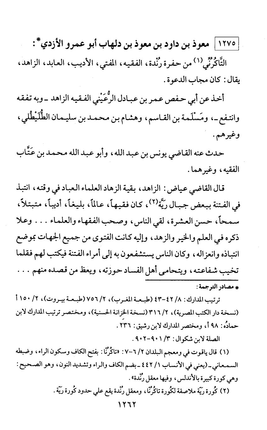 (¬1) قال ياقوت في ومعجم البلدان 2/ 6 - 7: «تاكرنّا: بفتح الكاف وسكون الراء، وضبطه السمعاني - (يعني في الأنساب 1/ 442 - بضم الكاف والراء وتشديد النون، وهو الصحيح: وهي كورة كبيرة بالأندلس، وفيها معقل رندة».