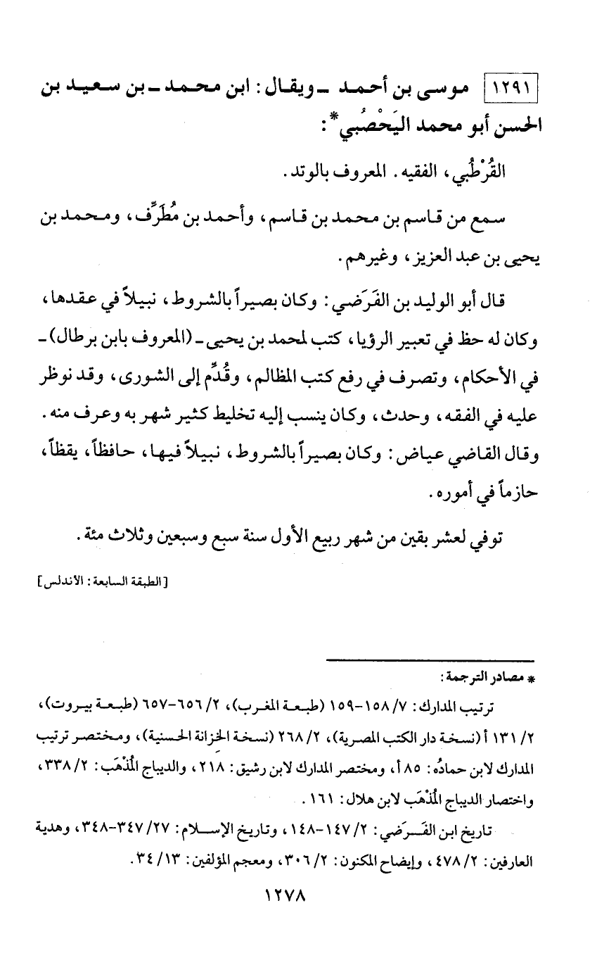 * مصادر الترجمة: ترتيب المدارك: 7/ 158 - 159 (طبعة المغرب)، 2/ 656 - 657 (طبعة بيروت)، 2/ 131 أ (نسخة دار الكتب المصرية)، 2/ 268 (نسخة الخزانة الحسنية)، ومختصر ترتيب المدارك لابن حماده: 85 أ، ومختصر المدارك لابن رشيق: 218، والديباج المذهب: 2/ 338، واختصار الديباج المذهب لابن هلال: 161. تاريخ ابن الفرضي: 2/ 147 - 148، وتاريخ الإسلام: 27/ 347 - 348، وهدية العارفين: 2/ 478، وإيضاح المكنون: 2/ 306، ومعجم المؤلفين: 13/ 34.