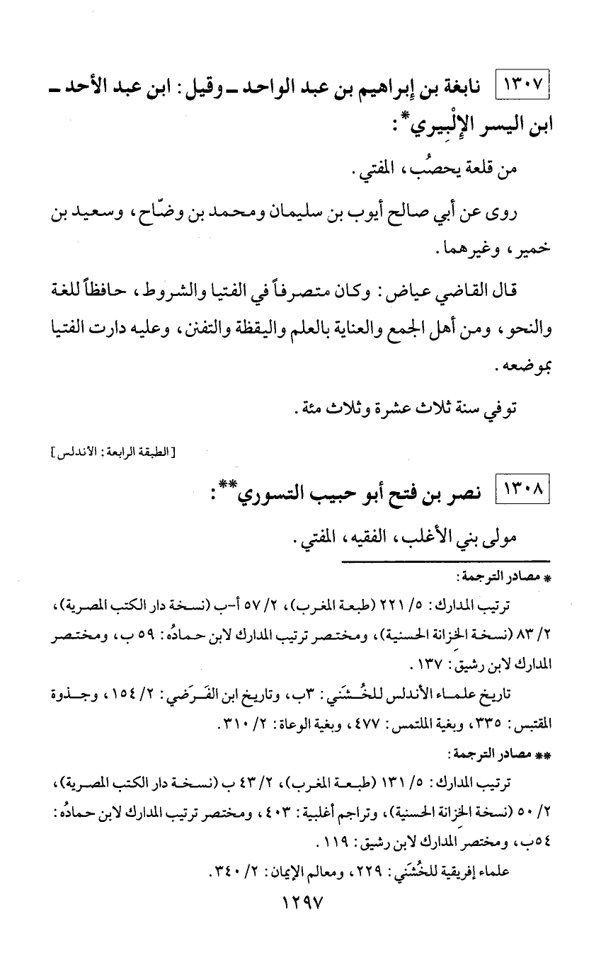 * مصادر الترجمة: ترتيب المدارك: 5/ 221 (طبعة المغرب)، 2/ 57 أ - ب (نسخة دار الكتب المصرية)، 2/ 83 (نسخة الخزانة الحسنية)، ومختصر ترتيب المدارك لابن حماده: 59 ب، ومختصر المدارك لابن رشيق: 137. تاريخ علماء الأندلس للخشني: 3 ب، وتاريخ ابن الفرضي: 2/ 154، وجذوة المقتبس: 335، وبغية الملتمس: 477، وبغية الوعاة: 2/ 310.