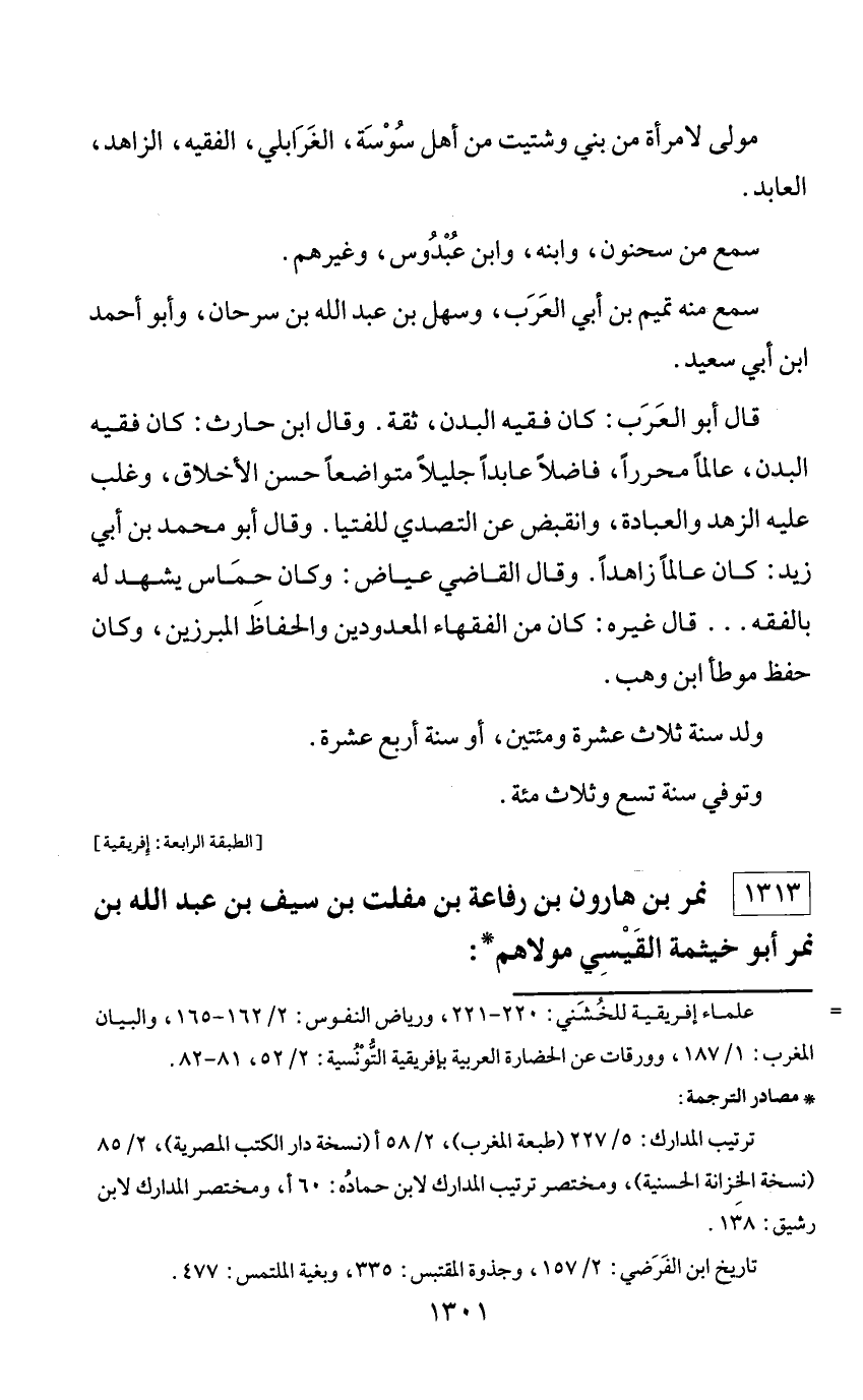 * مصادر الترجمة: ترتيب المدارك: 5/ 227 (طبعة المغرب)، 2/ 58 أ (نسخة دار الكتب المصرية)، 2/ 85 (نسخة الخزانة الحسنية)، ومختصر ترتيب المدارك لابن حماده: 60 أ، ومختصر المدارك لابن رشيق: 138. تاريخ ابن الفرضي: 2/ 157، وجذوة المقتبس: 335، وبغية الملتمس: 477.