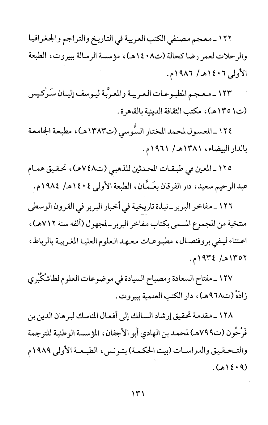 128 - مقدمة تحقيق إرشاد السالك إلى أفعال المناسك لبرهان الدين بن فرحون (ت 799 هـ) لمحمد بن الهادي أبو الأجفان، المؤسسة الوطنية للترجمة والتحقيق والدراسات (بيت الحكمة) بتونس، الطبعة الأولى 1989 م (1409 هـ).