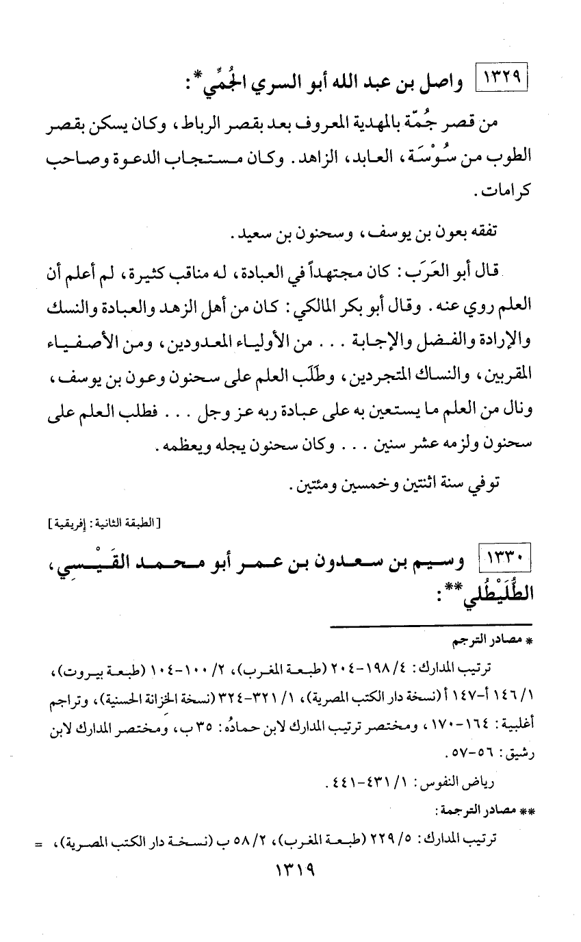 * مصادر الترجمة: ترتيب المدارك: 4/ 198 - 204 (طبعة المغرب)، 2/ 100 - 104 (طبعة بيروت)، 1/ 146 أ - 147 أ (نسخة دار الكتب المصرية)، 1/ 321 - 324 (نسخة الخزانة الحسنية)، وتراجم أغلبية: 164 - 170، ومختصر ترتيب المدارك لابن حماده: 35 ب، ومختصر المدارك لابن رشيق: 56 - 57. رياض النفوس: 1/ 431 - 441.