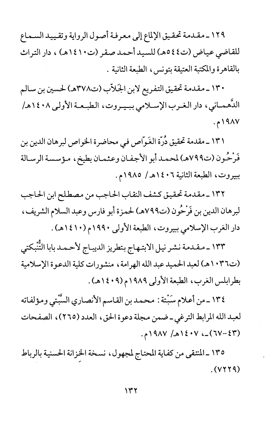 133 - مقدمة نشر نيل الابتهاج بتطريز الديباج لأحمد بابا التّنبكتي (ت 1036 هـ) لعبد الحميد عبد الله الهرامة، منشورات كلية الدعوة الإسلامية بطرابلس الغرب، الطبعة الأولى 1989 م (1409 هـ).