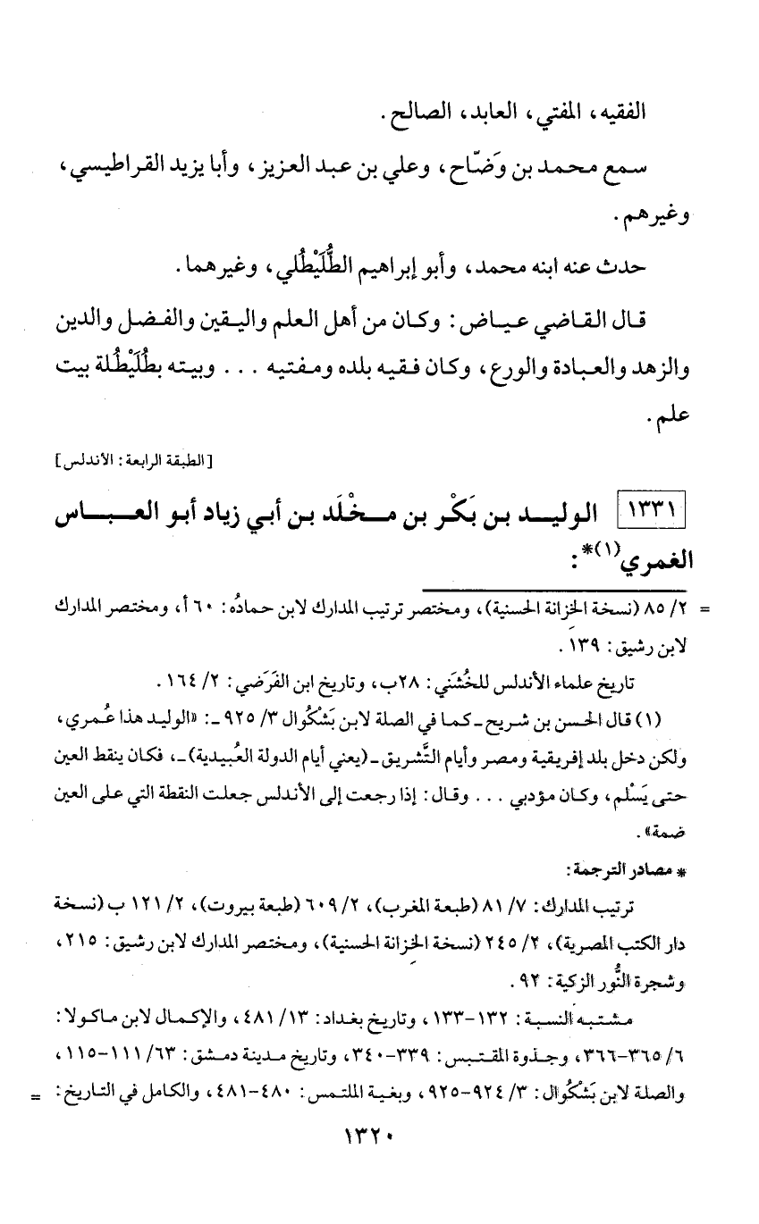 * مصادر الترجمة: ترتيب المدارك: 7/ 81 (طبعة المغرب)، 2/ 609 (طبعة بيروت)، 2/ 121 ب (نسخة دار الكتب المصرية)، 2/ 245 (نسخة الخزانة الحسنية)، ومختصر المدارك لابن رشيق: 215، وشجرة النّور الزكية: 92. مشتبه النسبة: 132 - 133، وتاريخ بغداد: 13/ 481، والإكمال لابن ماكولا: 6/ 365 - 366، وجذوة المقتبس: 339 - 340، وتاريخ مدينة دمشق: 63/ 111 - 115، والصلة لابن بشكوال: 3/ 924 - 925، وبغية الملتمس: 480 - 481، والكامل في التاريخ: =