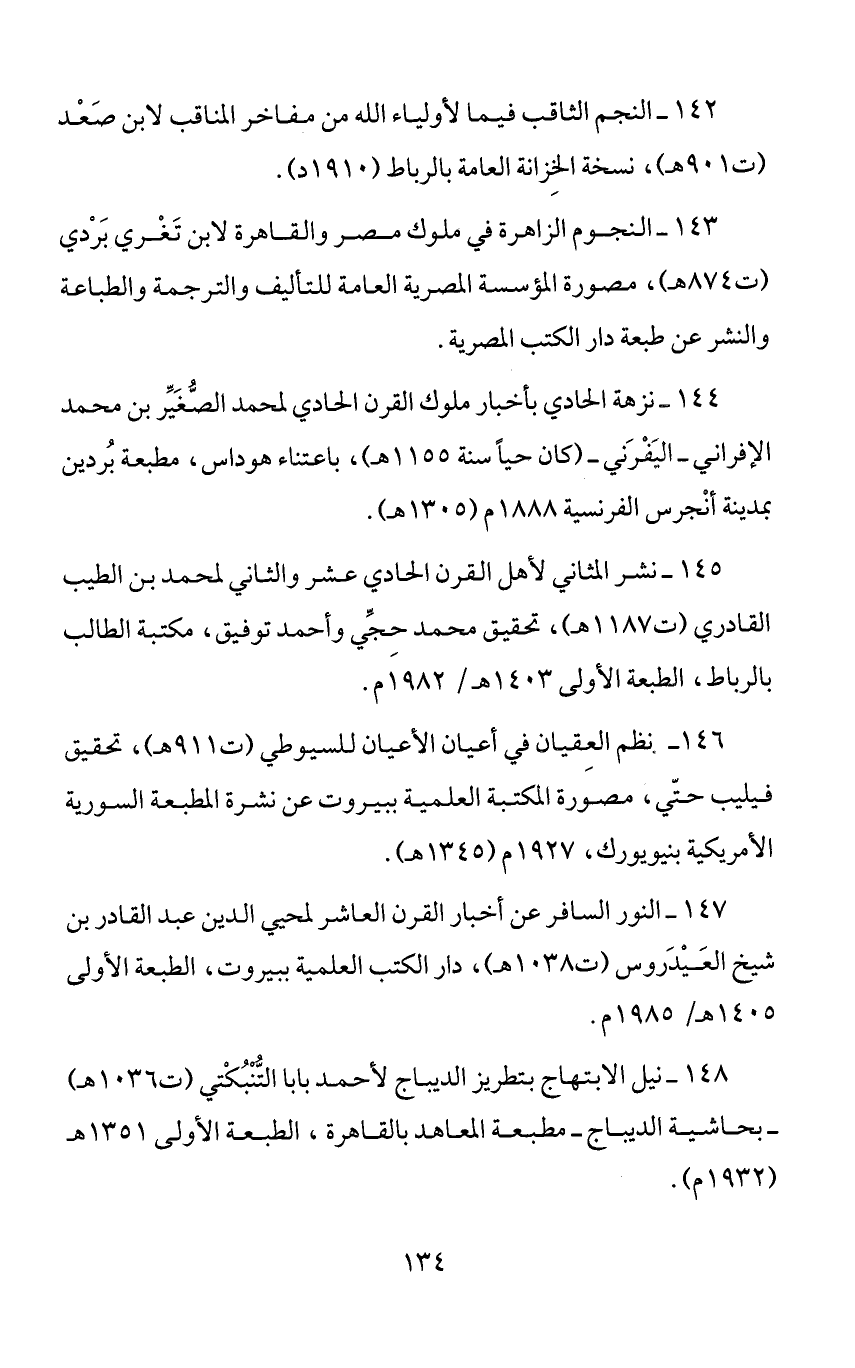 144 - نزهة الحادي بأخبار ملوك القرن الحادي لمحمد الصّغيّر بن محمد الإفراني - اليفرني - (كان حيا سنة 1155 هـ)، باعتناء هوداس، مطبعة بردين بمدينة أنجرس الفرنسية 1888 م (1305 هـ).