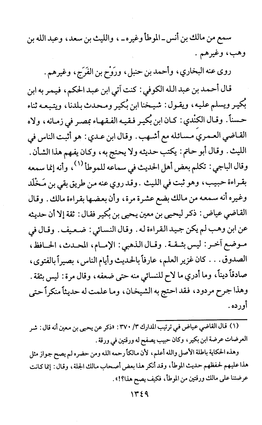وقال الباجي: تكلم بعض أهل الحديث في سماعه للموطأ (¬1)، وأنه إنما سمعه بقراءة حبيب، وهو ثبت في الليث. وقد روي عنه من طريق بقي بن مخلد وغيره أنه سمعه من مالك بضع عشرة مرة، وأن بعضها بقراءة مالك. وقال القاضي عياض: ذكر ليحيى بن معين يحيى بن بكير فقال: ثقة إلا أن حديثه عن ابن وهب لم يكن جيد القراءة له. وقال النسائي: ضعيف. وقال في موضع آخر: ليس بثقة. وقال الذهبي: الإمام، المحدث، الحافظ، الصدوق. . . كان غزير العلم، عارفا بالحديث وأيام الناس، بصيرا بالفتوى، صادقا دينا، وما أدري ما لاح للنسائي منه حتى ضعفه، وقال مرة: ليس بثقة.