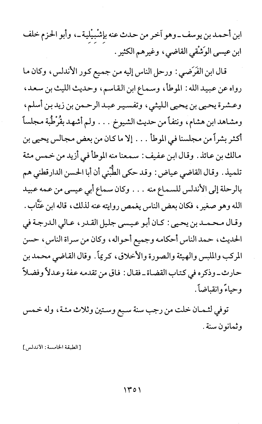 وقال محمد بن يحيى: كان أبو عيسى جليل القدر، عالي الدرجة في الحديث، حمد الناس أحكامه وجميع أحواله، وكان من سراة الناس، حسن المركب والملبس والهيئة والصورة والأخلاق، كريما. وقال القاضي محمد بن حارث - وذكره في كتاب القضاة - فقال: فاق من تقدمه عفة وعدلا وفضلا وحياء وانقباضا.
