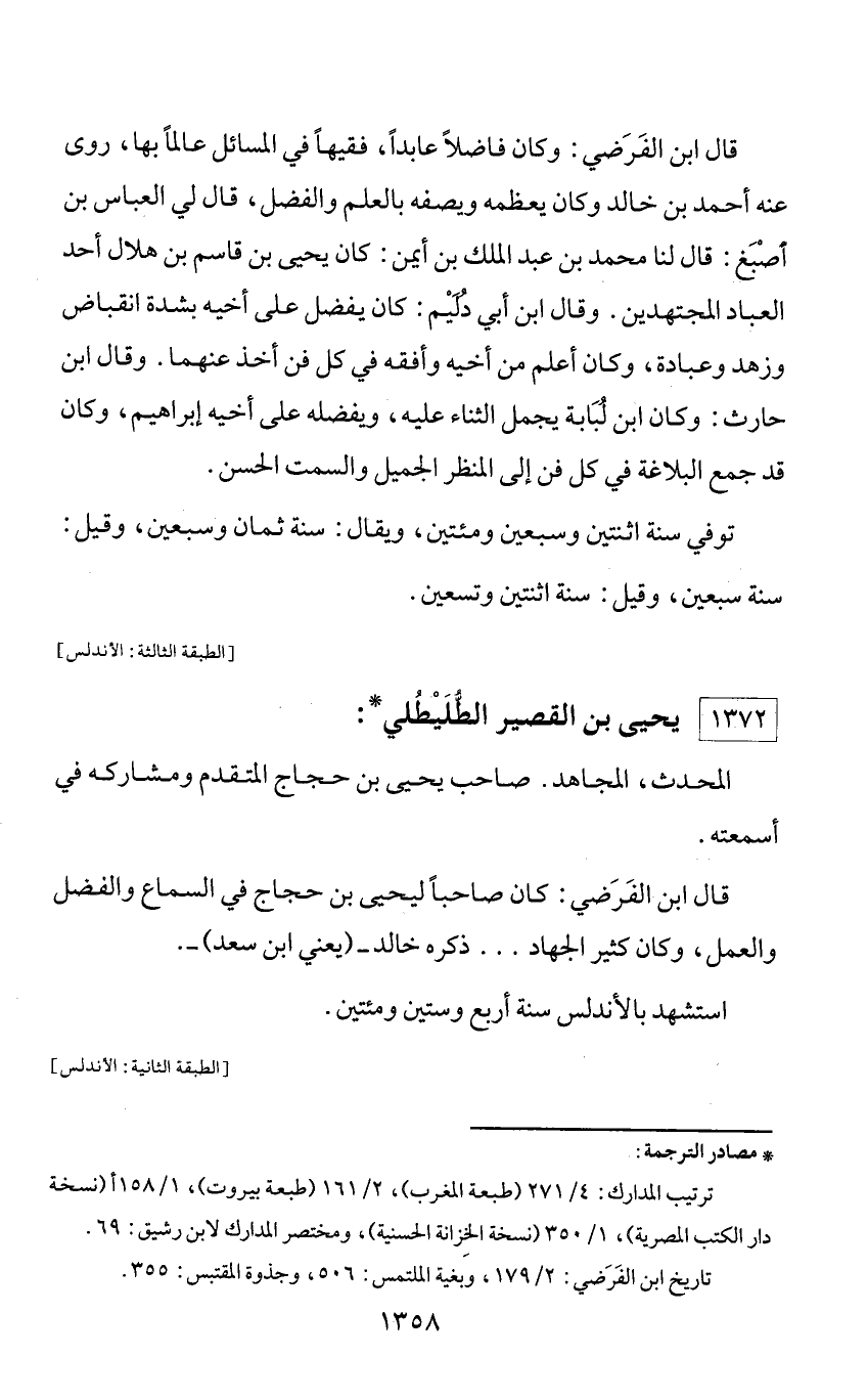* مصادر الترجمة: ترتيب المدارك: 4/ 271 (طبعة المغرب)، 2/ 161 (طبعة بيروت)، 1/ 158 أ (نسخة دار الكتب المصرية)، 1/ 350 (نسخة الخزانة الحسنية)، ومختصر المدارك لابن رشيق: 69. تاريخ ابن الفرضي: 2/ 179، وبغية الملتمس: 506، وجذوة المقتبس: 355.