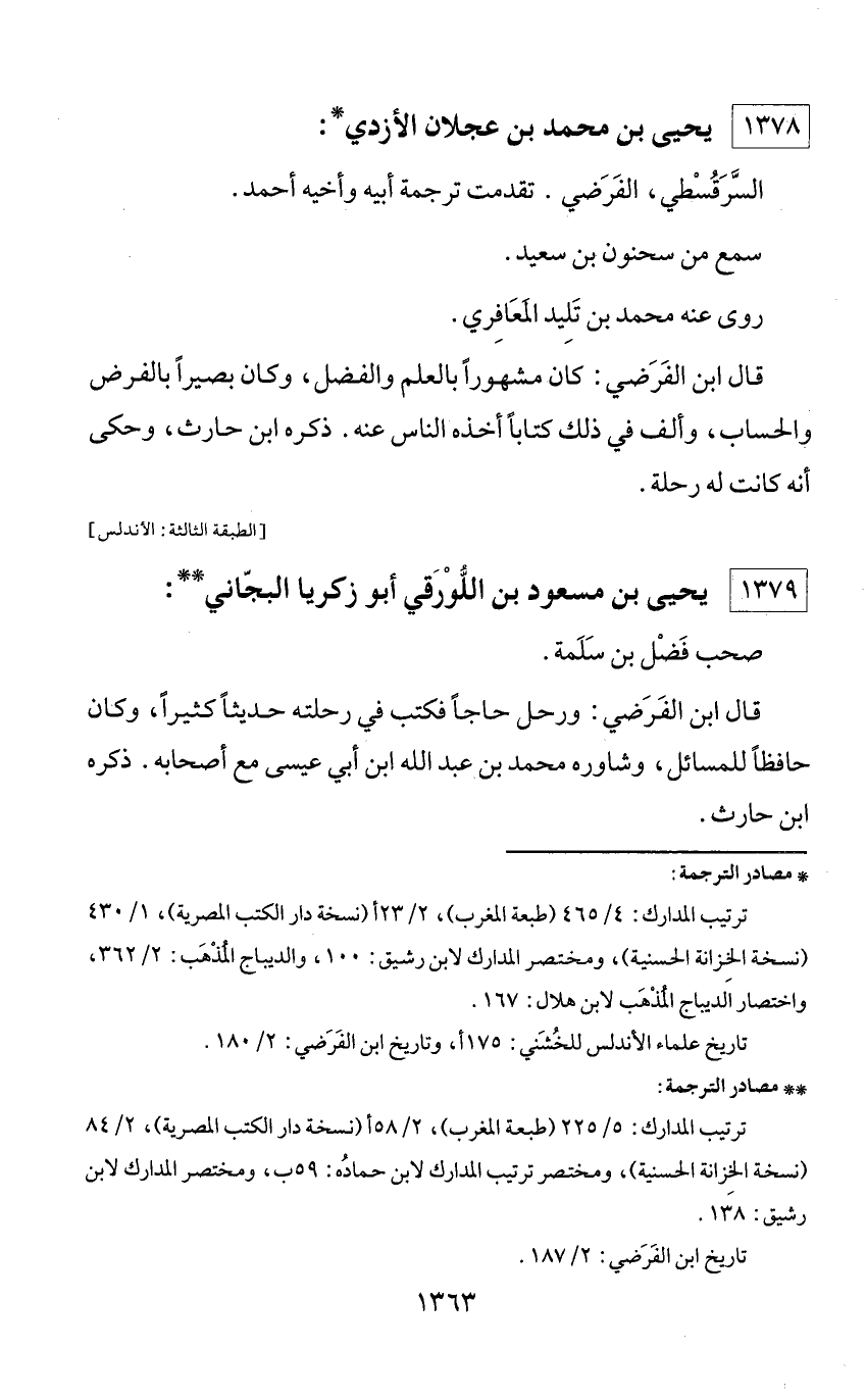 * مصادر الترجمة: ترتيب المدارك: 4/ 465 (طبعة المغرب)، 2/ 23 أ (نسخة دار الكتب المصرية)، 1/ 430 (نسخة الخزانة الحسنية)، ومختصر المدارك لابن رشيق: 100، والديباج المذهب: 2/ 362، واختصار الديباج المذهب لابن هلال: 167. تاريخ علماء الأندلس للخشني: 175 أ، وتاريخ ابن الفرضي: 2/ 180.