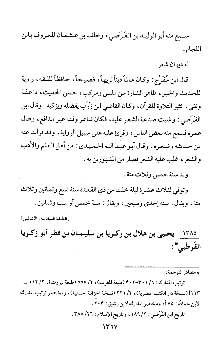 * مصادر الترجمة: ترتيب المدارك: 6/ 301 - 302 (طبعة المغرب)، 2/ 557 (طبعة بيروت)، 2/ 112 ب - 113 أ (نسخة دار الكتب المصرية)، 2/ 221 (نسخة الخزانة الحسنية)، ومختصر ترتيب المدارك لابن حماده: 75 أ، ومختصر المدارك لابن رشيق: 203. تاريخ ابن الفرضي: 2/ 189، وتاريخ الإسلام: 26/ 388.