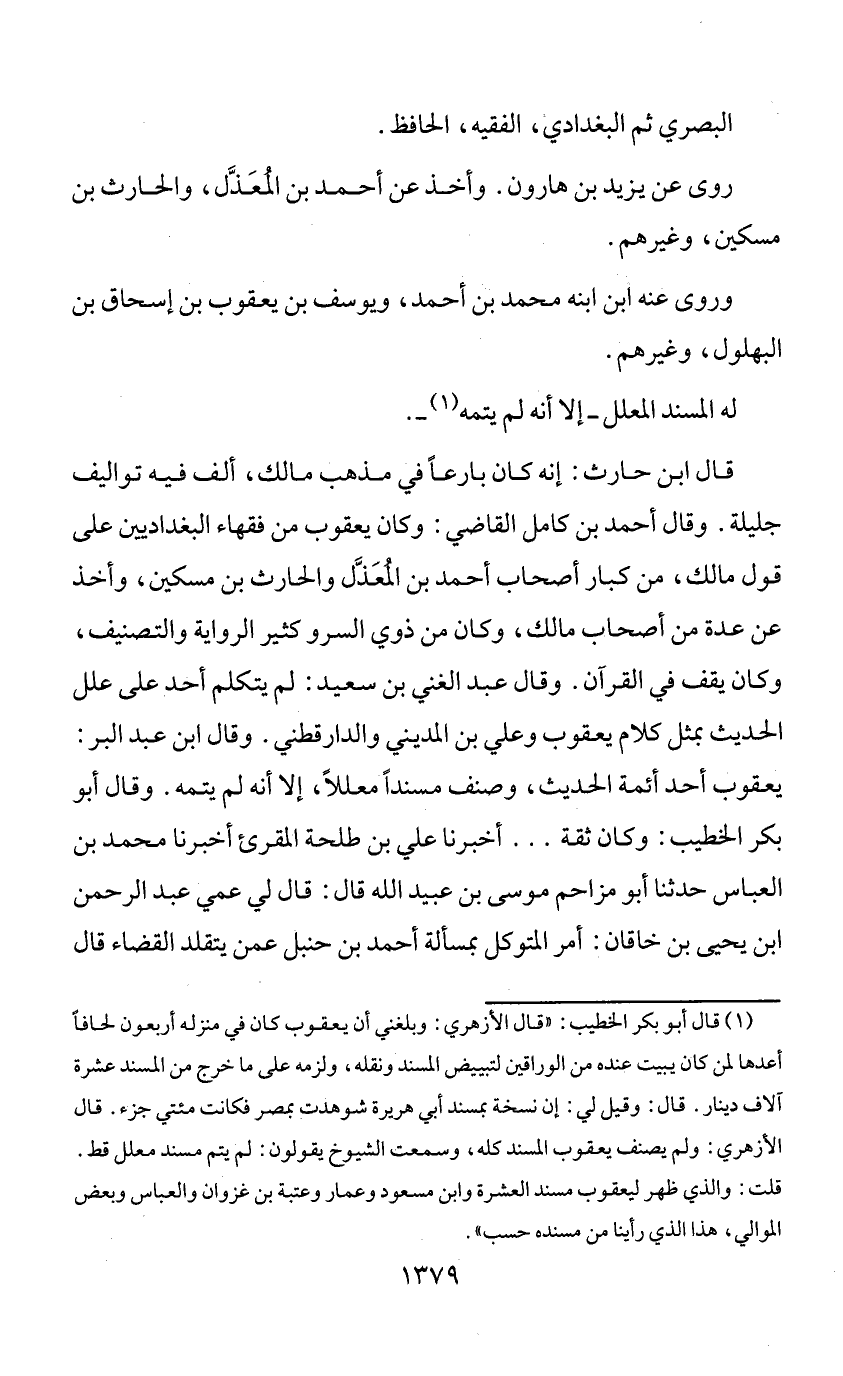 (¬1) قال أبو بكر الخطيب: «قال الأزهري: وبلغني أن يعقوب كان في منزله أربعون لحافا أعدها لمن كان يبيت عنده من الوراقين لتبييض المسند ونقله، ولزمه على ما خرج من المسند عشرة آلاف دينار. قال: وقيل لي: إن نسخة بمسند أبي هريرة شوهدت بمصر فكانت مئتي جزء. قال الأزهري: ولم يصنف يعقوب المسند كله، وسمعت الشيوخ يقولون: لم يتم مسند معلل قط. قلت: والذي ظهر ليعقوب مسند العشرة وابن مسعود وعمار وعتبة بن غزوان والعباس وبعض الموالي، هذا الذي رأينا من مسنده حسب».