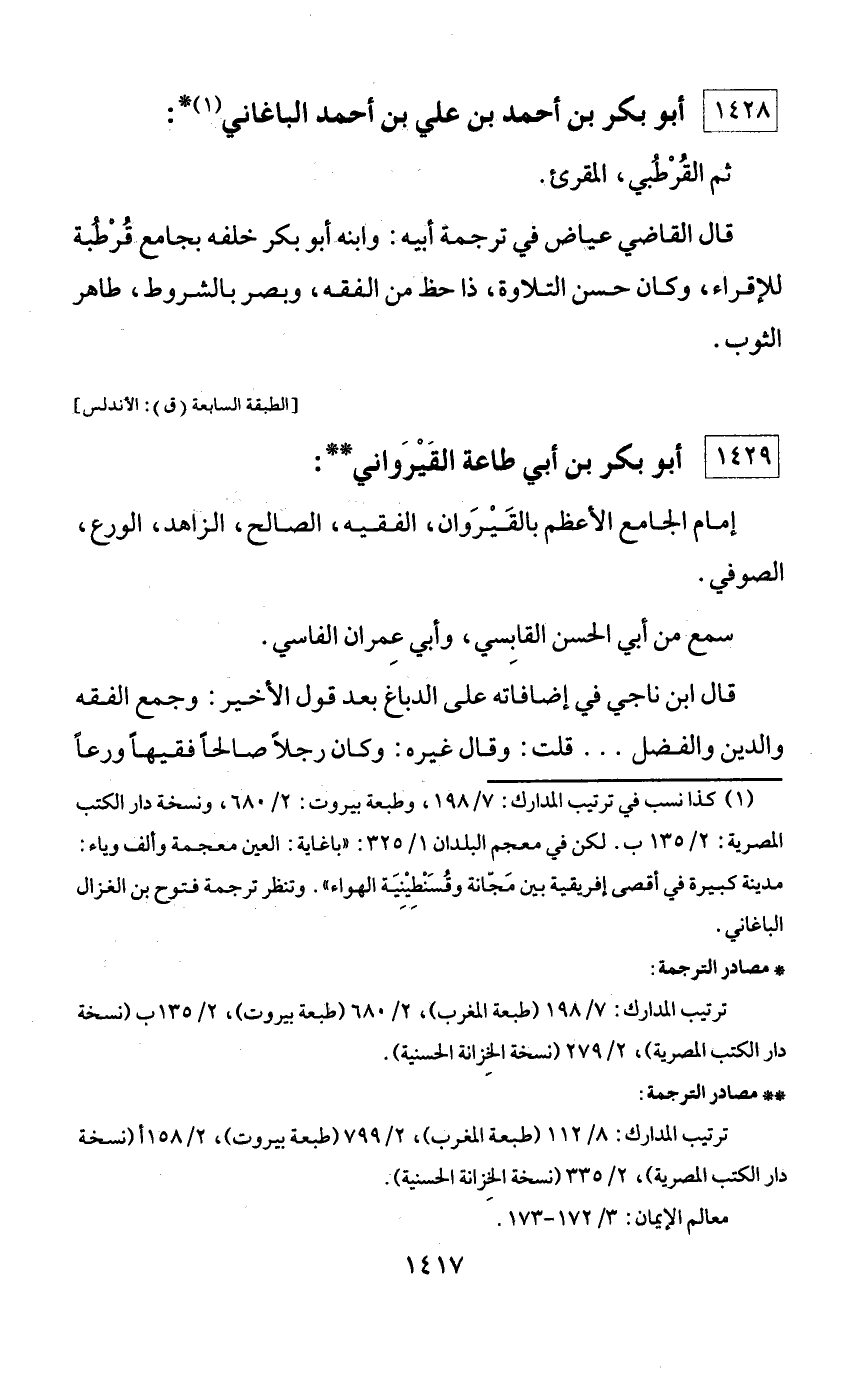 (¬1) كذا نسب في ترتيب المدارك: 7/ 198، وطبعة بيروت: 2/ 680، ونسخة دار الكتب المصرية: 2/ 135 ب. لكن في معجم البلدان 1/ 325: «باغاية: العين معجمة وألف وياء: مدينة كبيرة في أقصى إفريقية بين مجّانة وقسنطينية الهواء». وتنظر ترجمة فتوح بن الغزال الباغاني.