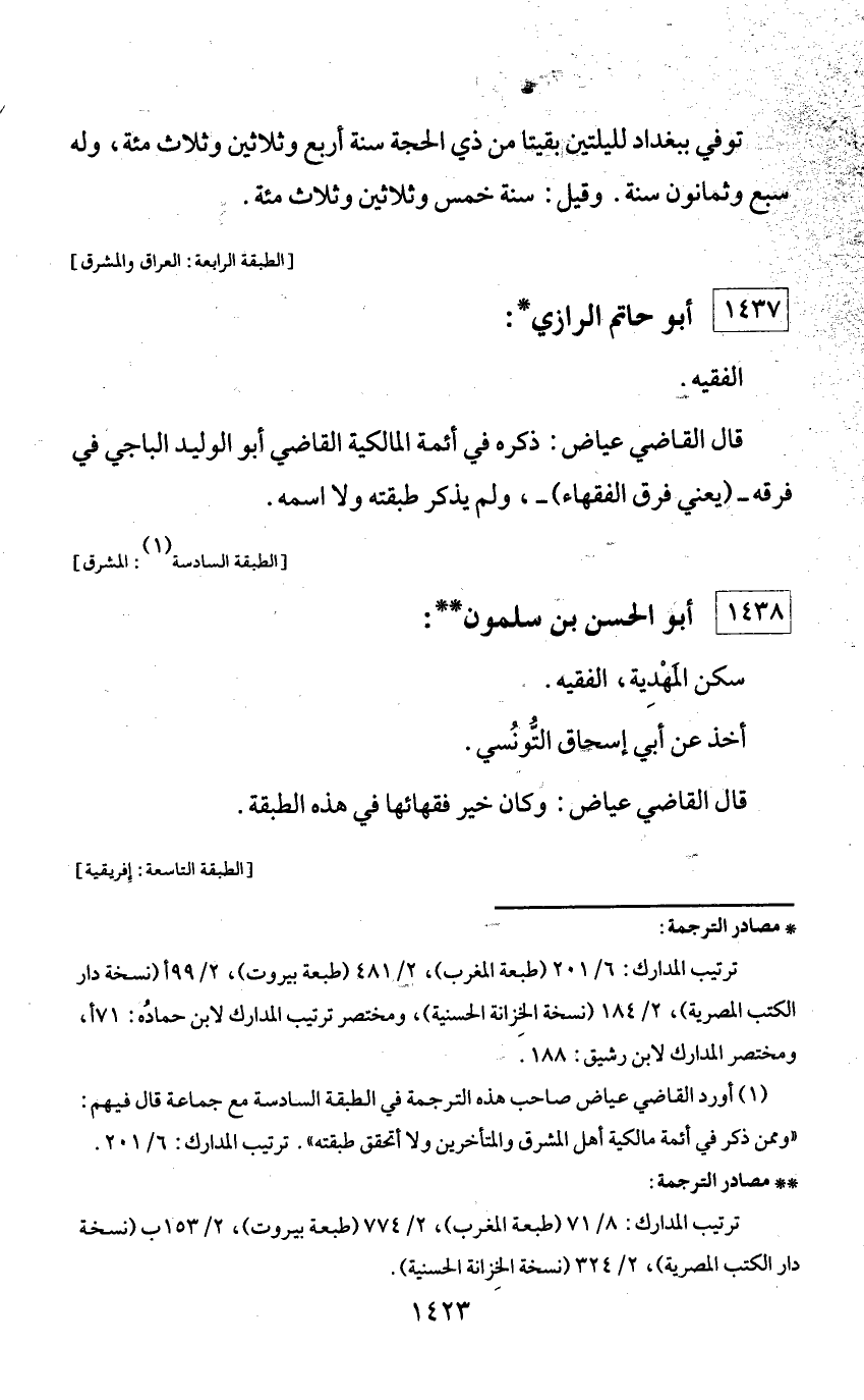 (¬1) أورد القاضي عياض صاحب هذه الترجمة في الطبقة السادسة مع جماعة قال فيهم: «وممن ذكر في أئمة مالكية أهل المشرق والمتأخرين ولا أتحقق طبقته». ترتيب المدارك: 6/ 201.