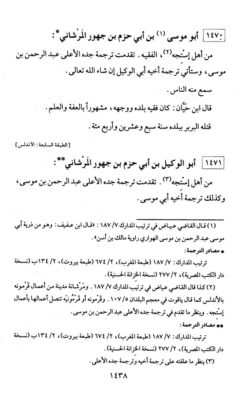 (¬1) قال القاضي عياض في ترتيب المدارك 7/ 187: «قال ابن عفيف: وهو من ذرية أبي موسى عبد الرحمن بن موسى الهواري راوية مالك بن أنس».