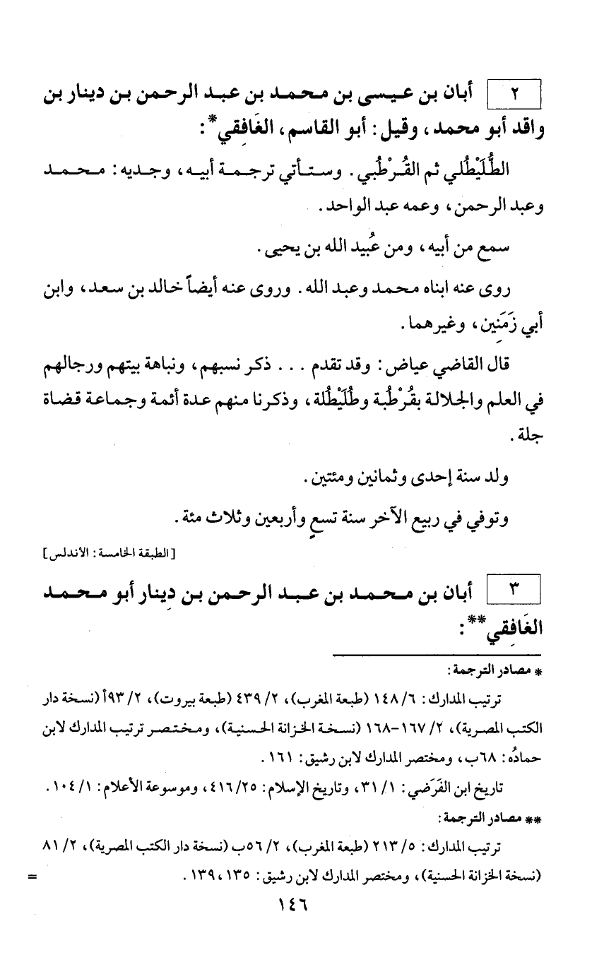 * مصادر الترجمة: ترتيب المدارك: 6/ 148 (طبعة المغرب)، 2/ 439 (طبعة بيروت)، 2/ 93 أ (نسخة دار الكتب المصرية)، 2/ 167 - 168 (نسخة الخزانة الحسنية)، ومختصر ترتيب المدارك لابن حماده: 68 ب، ومختصر المدارك لابن رشيق: 161. تاريخ ابن الفرضي: 1/ 31، وتاريخ الإسلام: 25/ 416، وموسوعة الأعلام: 1/ 104.