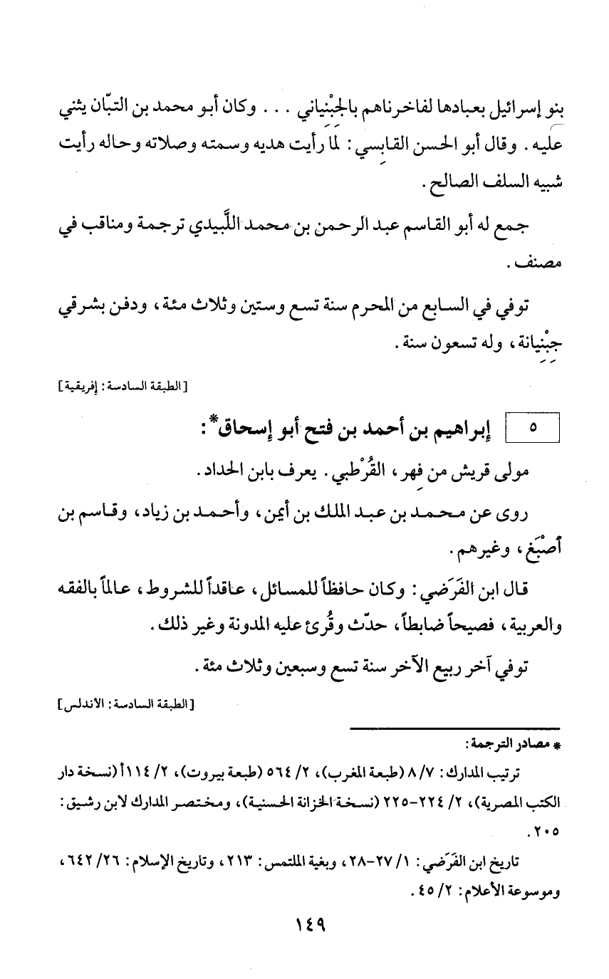 * مصادر الترجمة: ترتيب المدارك: 7/ 8 (طبعة المغرب)، 2/ 564 (طبعة بيروت)، 2/ 114 أ (نسخة دار الكتب المصرية)، 2/ 224 - 225 (نسخة الخزانة الحسنية)، ومختصر المدارك لابن رشيق: 205. تاريخ ابن الفرضي: 1/ 27 - 28، وبغية الملتمس: 213، وتاريخ الإسلام: 26/ 642، وموسوعة الأعلام: 2/ 45.