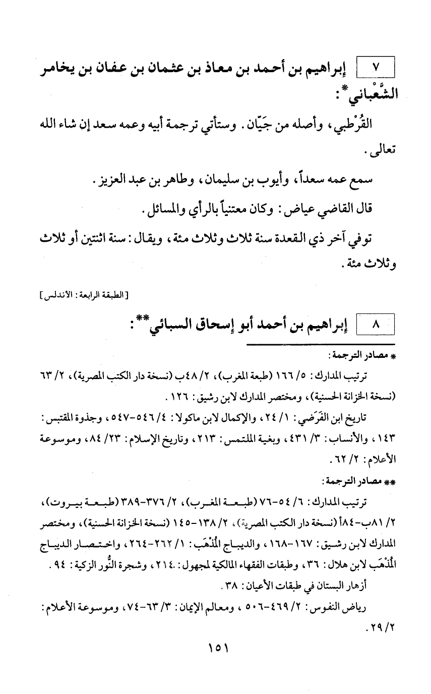 * مصادر الترجمة: ترتيب المدارك: 5/ 166 (طبعة المغرب)، 2/ 48 ب (نسخة دار الكتب المصرية)، 2/ 63 (نسخة الخزانة الحسنية)، ومختصر المدارك لابن رشيق: 126. تاريخ ابن الفرضي: 1/ 24، والإكمال لابن ماكولا: 4/ 546 - 547، وجذوة المقتبس: 143، والأنساب: 3/ 431، وبغية الملتمس: 213، وتاريخ الإسلام: 23/ 84، وموسوعة الأعلام: 2/ 62.