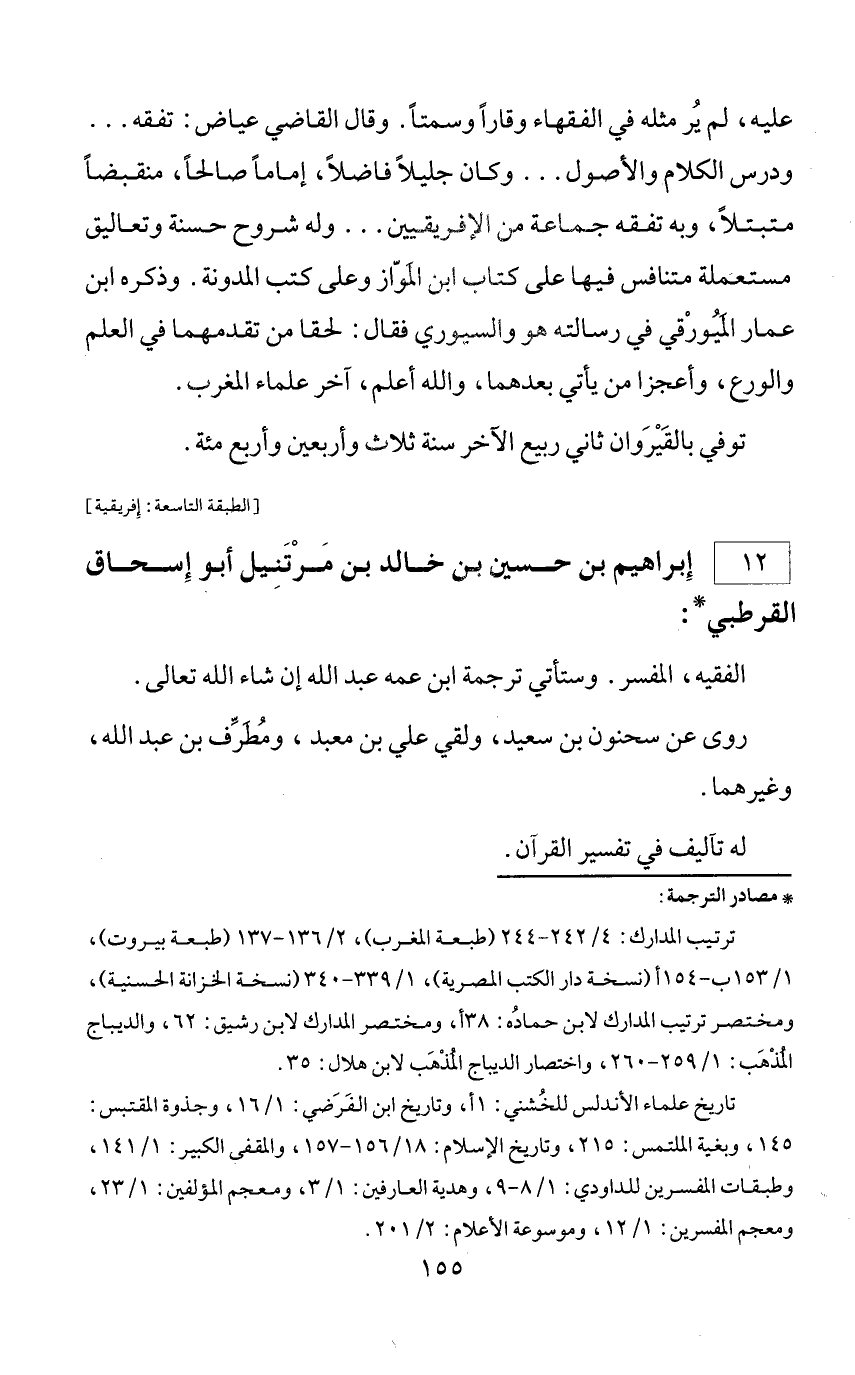 * مصادر الترجمة: ترتيب المدارك: 4/ 242 - 244 (طبعة المغرب)، 2/ 136 - 137 (طبعة بيروت)، 1/ 153 ب - 154 أ (نسخة دار الكتب المصرية)، 1/ 339 - 340 (نسخة الخزانة الحسنية)، ومختصر ترتيب المدارك لابن حماده: 38 أ، ومختصر المدارك لابن رشيق: 62، والديباج المذهب: 1/ 259 - 260، واختصار الديباج المذهب لابن هلال: 35. تاريخ علماء الأندلس للخشني: 1 أ، وتاريخ ابن الفرضي: 1/ 16، وجذوة المقتبس: 145، وبغية الملتمس: 215، وتاريخ الإسلام: 18/ 156 - 157، والمقفى الكبير: 1/ 141، وطبقات المفسرين للداودي: 1/ 8 - 9، وهدية العارفين: 1/ 3، ومعجم المؤلفين: 1/ 23، ومعجم المفسرين: 1/ 12، وموسوعة الأعلام: 2/ 201.
