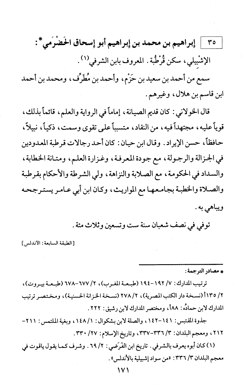 (¬1) كان أبوه يعرف بالشرفي. تاريخ ابن الفرضي: 2/ 69. وشرف كما يقول ياقوت في معجم البلدان 3/ 336: «من سواد إشبيلية بالأندلس».