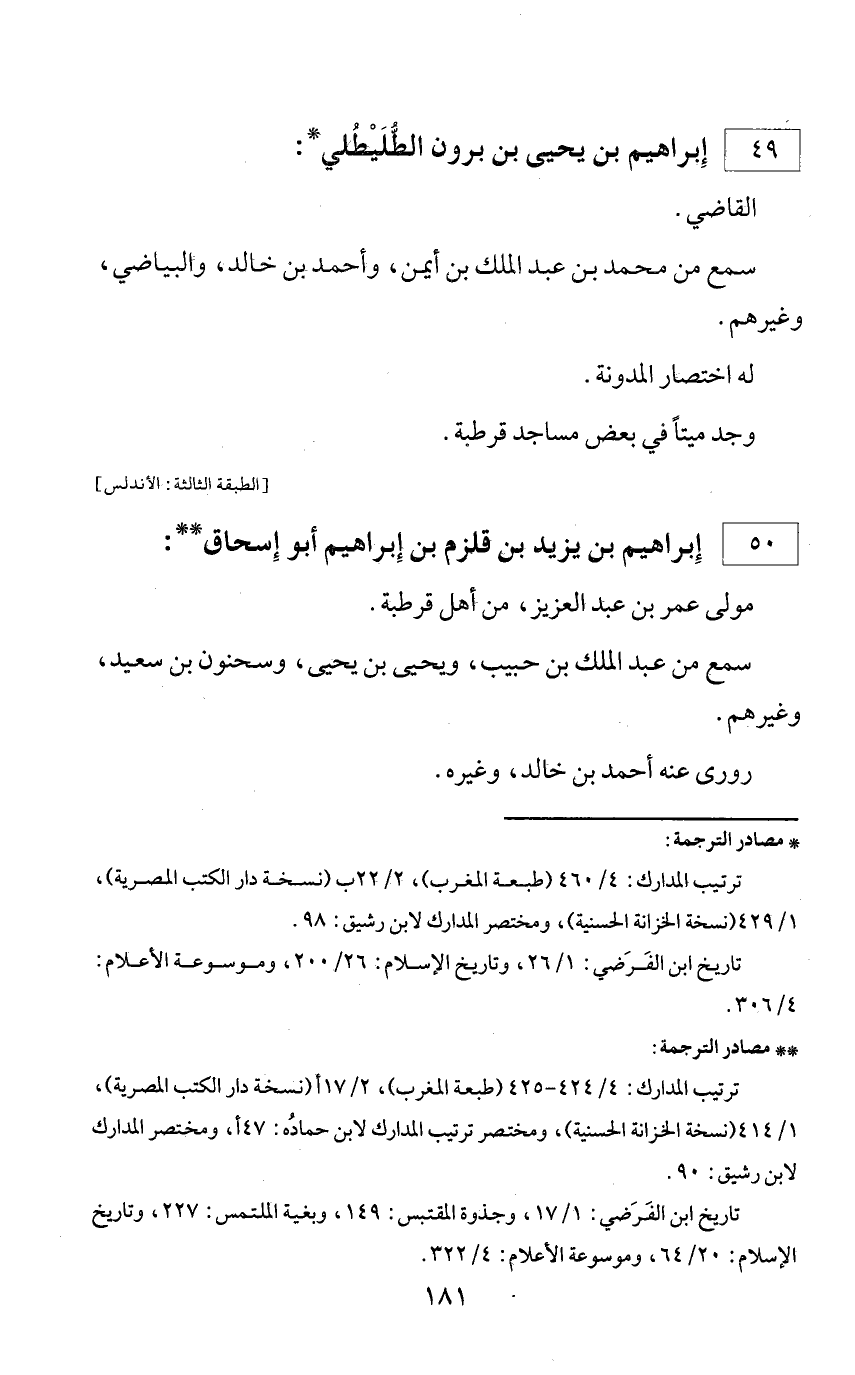 * مصادر الترجمة: ترتيب المدارك: 4/ 460 (طبعة المغرب)، 2/ 22 ب (نسخة دار الكتب المصرية)، 1/ 429 (نسخة الخزانة الحسنية)، ومختصر المدارك لابن رشيق: 98. تاريخ ابن الفرضي: 1/ 26، وتاريخ الإسلام: 26/ 200، وموسوعة الأعلام: 4/ 306.