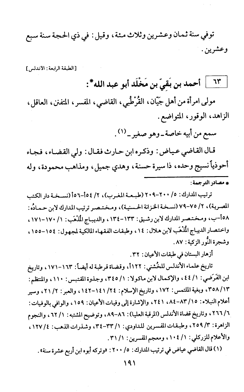 * مصادر الترجمة: ترتيب المدارك: 5/ 200 - 209 (طبعة المغرب)، 2/ 54 أ - 56 أ (نسخة دار الكتب المصرية)، 2/ 75 - 79 (نسخة الخزانة الحسنية)، ومختصر ترتيب المدارك لابن حماده: 58 أ - ب، ومختصر المدارك لابن رشيق: 133 - 134، والديباج المذهب: 1/ 170 - 171، واختصار الديباج المذهب لابن هلال: 14، وطبقات الفقهاء المالكية لمجهول: 154 - 155، وشجرة النّور الزكية: 87. أزهار البستان في طبقات الأعيان: 32. تاريخ علماء الأندلس للخشني: 122 أ، وقضاة قرطبة له أيضا: 163 - 171، وتاريخ ابن الفرضي: 1/ 44، والإكمال لابن ماكولا: 1/ 345، وجذوة المقتبس: 110، والمنتظم: 13/ 358، وبغية الملتمس: 172، وتاريخ الإسلام: 24/ 141 - 142، والعبر: 2/ 21، وسير أعلام النبلاء: 15/ 83 - 84، 241، والإشارة إلى وفيات الأعيان: 159، والوافي بالوفيات: 6/ 266، وتاريخ قضاة الأندلس (المرقبة العليا): 86 - 89، وتوضيح المشتبه: 1/ 62، والنجوم الزاهرة: 3/ 259، وطبقات المفسرين للداودي: 1/ 33 - 34، وشذرات الذهب: 4/ 127، والأعلام للزركلي: 1/ 104، ومعجم المفسرين: 1/ 31.