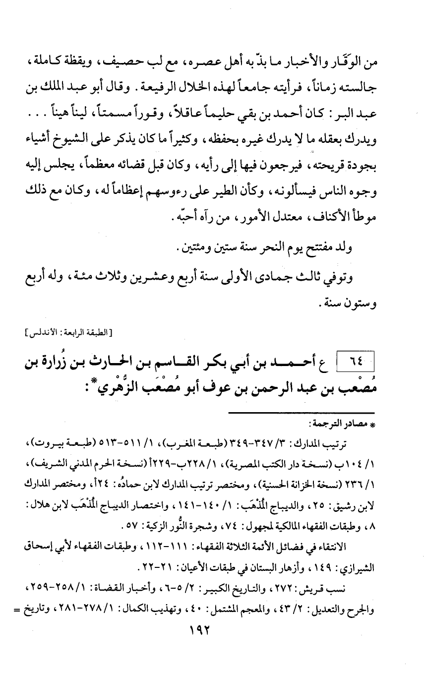 * مصادر الترجمة: ترتيب المدارك: 3/ 347 - 349 (طبعة المغرب)، 1/ 511 - 513 (طبعة بيروت)، 1/ 104 ب (نسخة دار الكتب المصرية)، 1/ 228 ب - 229 أ (نسخة الحرم المدني الشريف)، 1/ 236 (نسخة الخزانة الحسنية)، ومختصر ترتيب المدارك لابن حماده: 24 أ، ومختصر المدارك لابن رشيق: 25، والديباج المذهب: 1/ 140 - 141، واختصار الديباج المذهب لابن هلال: 8، وطبقات الفقهاء المالكية لمجهول: 74، وشجرة النّور الزكية: 57. الانتقاء في فضائل الأئمة الثلاثة الفقهاء: 111 - 112، وطبقات الفقهاء لأبي إسحاق الشيرازي: 149، وأزهار البستان في طبقات الأعيان: 21 - 22. نسب قريش: 272، والتاريخ الكبير: 2/ 5 - 6، وأخبار القضاة: 1/ 258 - 259، والجرح والتعديل: 2/ 43، والمعجم المشتمل: 40، وتهذيب الكمال: 1/ 278 - 281، وتاريخ =