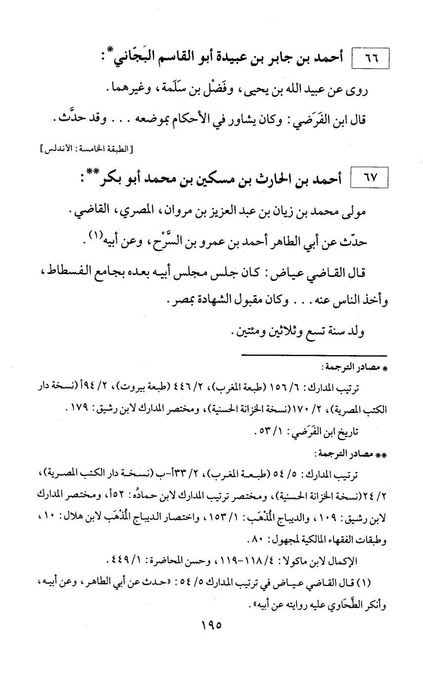 ** مصادر الترجمة: ترتيب المدارك: 5/ 54 (طبعة المغرب)، 2/ 33 أ - ب (نسخة دار الكتب المصرية)، 2/ 24 (نسخة الخزانة الحسنية)، ومختصر ترتيب المدارك لابن حماده: 52 أ، ومختصر المدارك لابن رشيق: 109، والديباج المذهب: 1/ 153، واختصار الديباج المذهب لابن هلال: 10، وطبقات الفقهاء المالكية لمجهول: 80. الإكمال لابن ماكولا: 4/ 118 - 119، وحسن المحاضرة: 1/ 449.