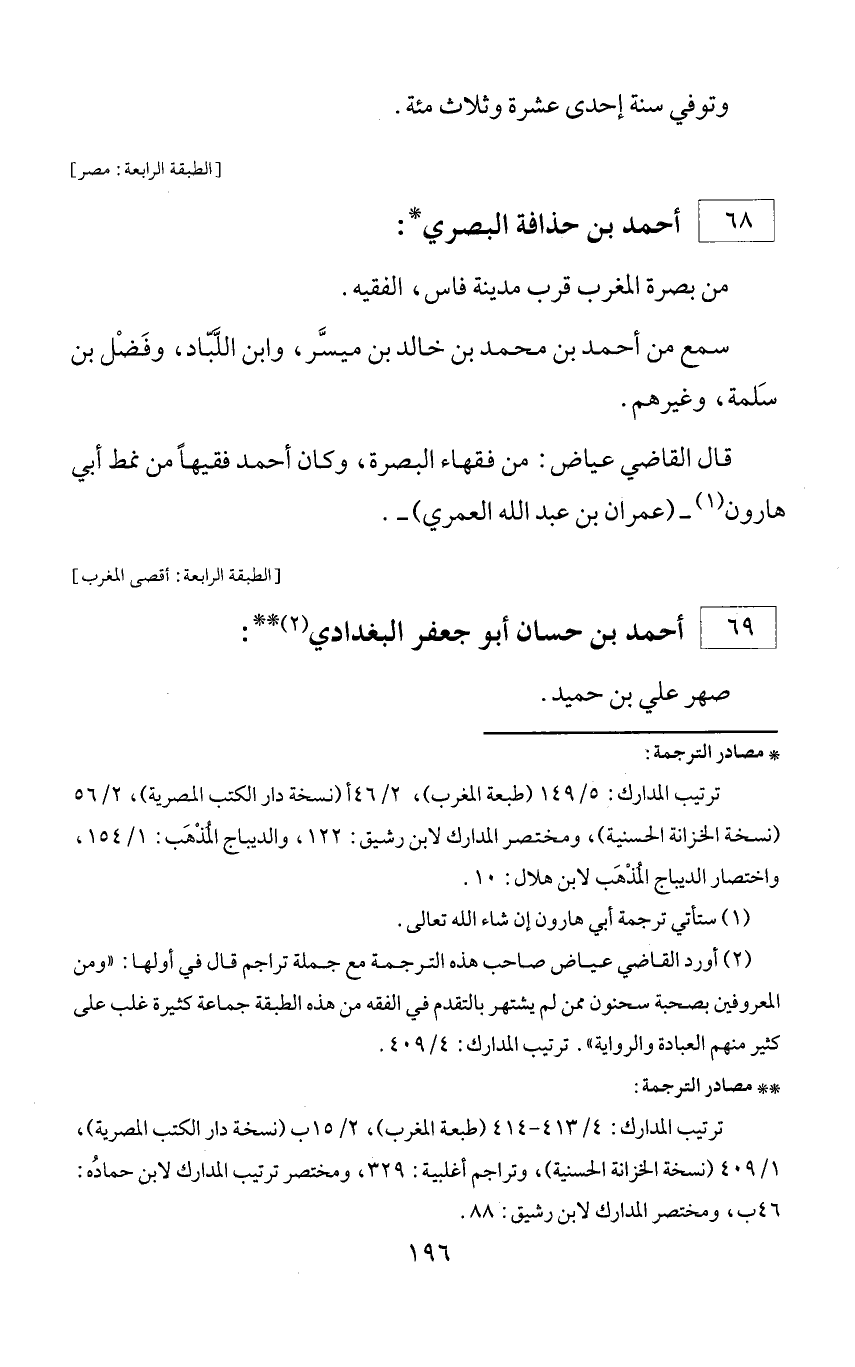 * مصادر الترجمة: ترتيب المدارك: 5/ 149 (طبعة المغرب)، 2/ 46 أ (نسخة دار الكتب المصرية)، 2/ 56 (نسخة الخزانة الحسنية)، ومختصر المدارك لابن رشيق: 122، والديباج المذهب: 1/ 154، واختصار الديباج المذهب لابن هلال: 10.