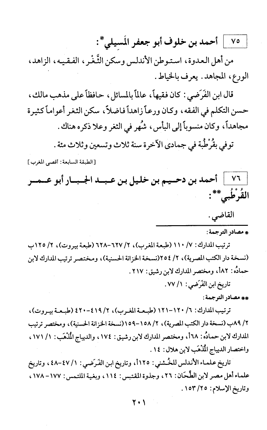 * مصادر الترجمة: ترتيب المدارك: 7/ 110 (طبعة المغرب)، 2/ 627 - 628 (طبعة بيروت)، 2/ 125 ب (نسخة دار الكتب المصرية)، 2/ 254 (نسخة الخزانة الحسنية)، ومختصر ترتيب المدارك لابن حماده: 82 أ، ومختصر المدارك لابن رشيق: 217. تاريخ ابن الفرضي: 1/ 77.