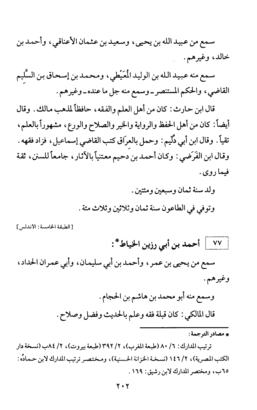 * مصادر الترجمة: ترتيب المدارك: 6/ 80 (طبعة المغرب)، 2/ 392 (طبعة بيروت)، 2/ 84 ب (نسخة دار الكتب المصرية)، 2/ 146 (نسخة الخزانة الحسنية)، ومختصر ترتيب المدارك لابن حماده: 65 ب، ومختصر المدارك لابن رشيق: 169.