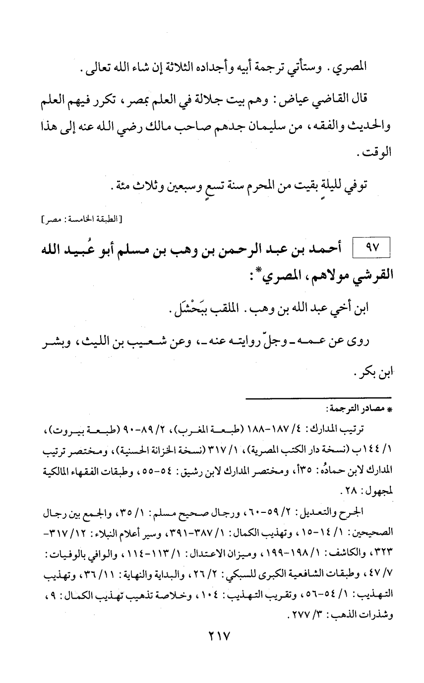 * مصادر الترجمة: ترتيب المدارك: 4/ 187 - 188 (طبعة المغرب)، 2/ 89 - 90 (طبعة بيروت)، 1/ 144 ب (نسخة دار الكتب المصرية)، 1/ 317 (نسخة الخزانة الحسنية)، ومختصر ترتيب المدارك لابن حماده: 35 أ، ومختصر المدارك لابن رشيق: 54 - 55، وطبقات الفقهاء المالكية لمجهول: 28. الجرح والتعديل: 2/ 59 - 60، ورجال صحيح مسلم: 1/ 35، والجمع بين رجال الصحيحين: 1/ 14 - 15، وتهذيب الكمال: 1/ 387 - 391، وسير أعلام النبلاء: 12/ 317 - 323، والكاشف: 1/ 198 - 199، وميزان الاعتدال: 1/ 113 - 114، والوافي بالوفيات: 7/ 47، وطبقات الشافعية الكبرى للسبكي: 2/ 26، والبداية والنهاية: 11/ 36، وتهذيب التهذيب: 1/ 54 - 56، وتقريب التهذيب: 104، وخلاصة تذهيب تهذيب الكمال: 9، وشذرات الذهب: 3/ 277.