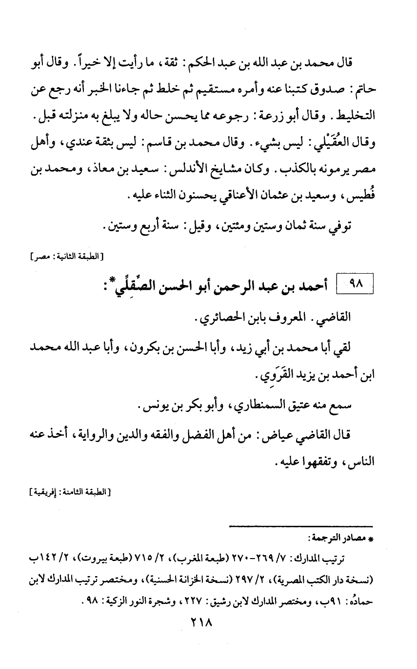 * مصادر الترجمة: ترتيب المدارك: 7/ 269 - 270 (طبعة المغرب)، 2/ 715 (طبعة بيروت)، 2/ 142 ب (نسخة دار الكتب المصرية)، 2/ 297 (نسخة الخزانة الحسنية)، ومختصر ترتيب المدارك لابن حماده: 91 ب، ومختصر المدارك لابن رشيق: 227، وشجرة النور الزكية: 98.