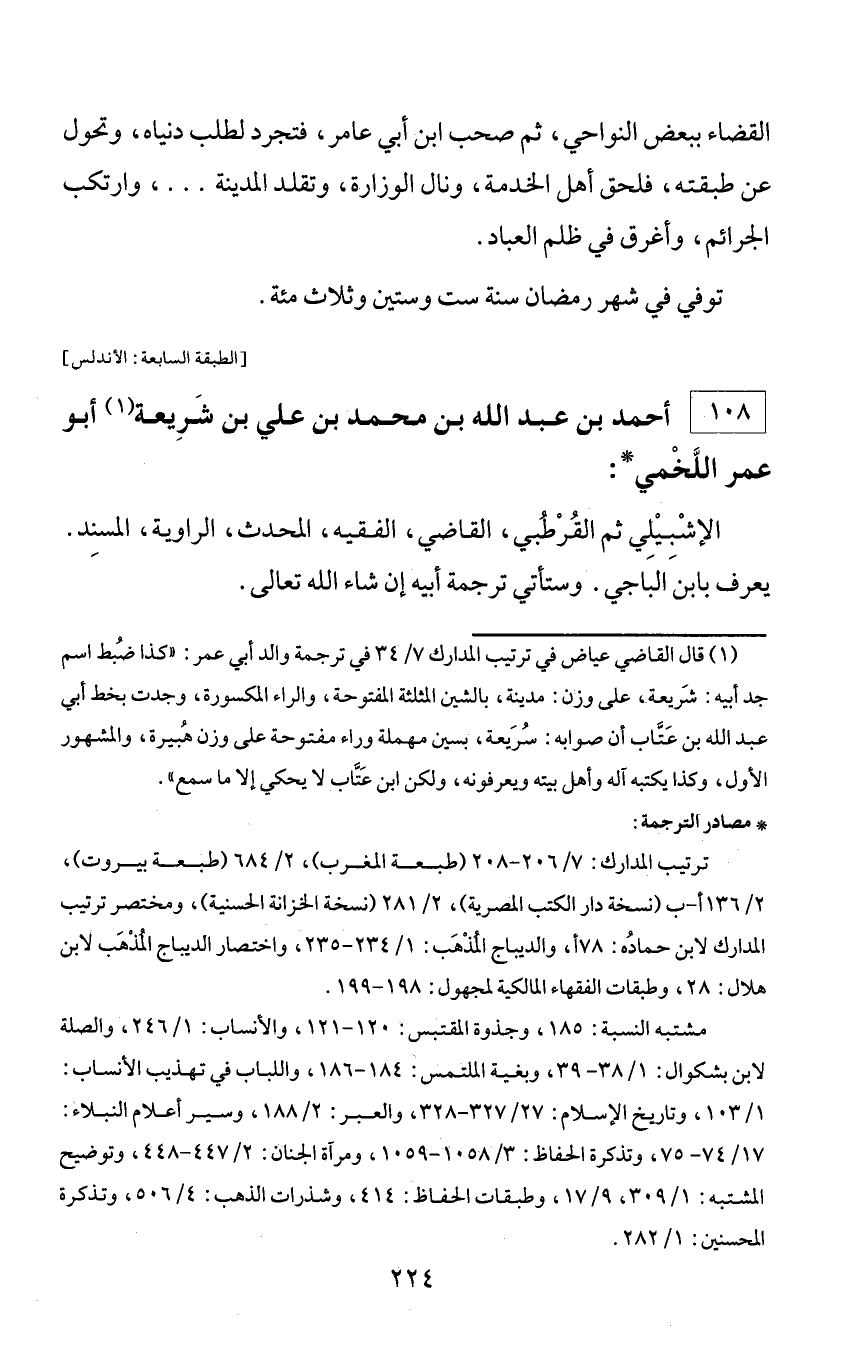 (¬1) قال القاضي عياض في ترتيب المدارك 7/ 34 في ترجمة والد أبي عمر: «كذا ضبط اسم جد أبيه: شريعة، على وزن: مدينة، بالشين المثلثة المفتوحة، والراء المكسورة، وجدت بخط أبي عبد الله بن عتّاب أن صوابه: سريعة، بسين مهملة وراء مفتوحة على وزن هبيرة، والمشهور الأول، وكذا يكتبه آله وأهل بيته ويعرفونه، ولكن ابن عتّاب لا يحكي إلا ما سمع».