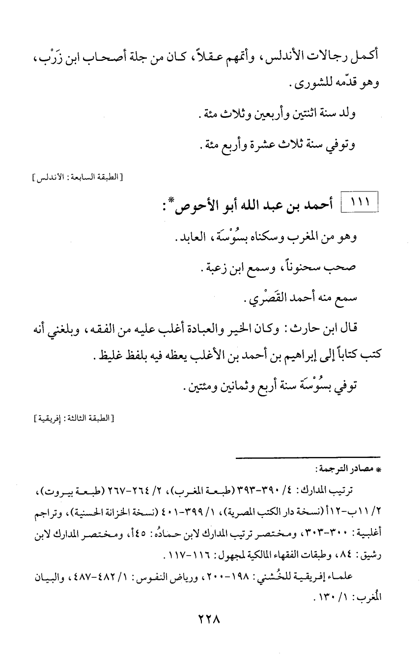 * مصادر الترجمة: ترتيب المدارك: 4/ 390 - 393 (طبعة المغرب)، 2/ 264 - 267 (طبعة بيروت)، 2/ 11 ب - 12 أ (نسخة دار الكتب المصرية)، 1/ 399 - 401 (نسخة الخزانة الحسنية)، وتراجم أغلبية: 300 - 303، ومختصر ترتيب المدارك لابن حماده: 45 أ، ومختصر المدارك لابن رشيق: 84، وطبقات الفقهاء المالكية لمجهول: 116 - 117. علماء إفريقية للخشني: 198 - 200، ورياض النفوس: 1/ 482 - 487، والبيان المغرب: 1/ 130.