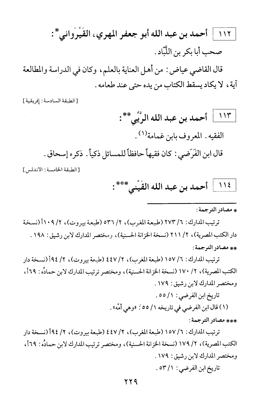 ... مصادر الترجمة: ترتيب المدارك: 6/ 157 (طبعة المغرب)، 2/ 447 (طبعة بيروت)، 2/ 94 أ (نسخة دار الكتب المصرية)، 2/ 179 (نسخة الخزانة الحسنية)، ومختصر ترتيب المدارك لابن حماده: 69 أ، ومختصر المدارك لابن رشيق: 179. تاريخ ابن الفرضي: 1/ 53.