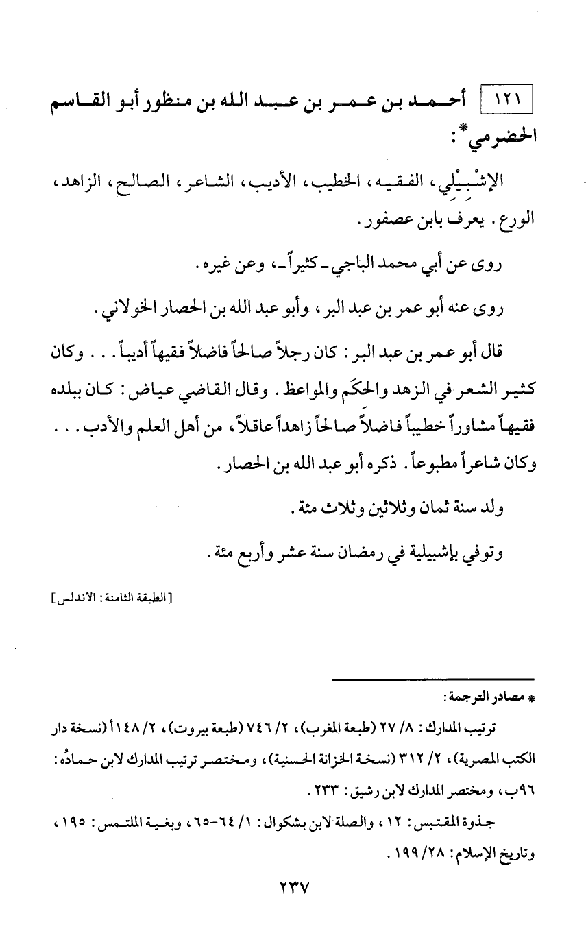 * مصادر الترجمة: ترتيب المدارك: 8/ 27 (طبعة المغرب)، 2/ 746 (طبعة بيروت)، 2/ 148 أ (نسخة دار الكتب المصرية)، 2/ 312 (نسخة الخزانة الحسنية)، ومختصر ترتيب المدارك لابن حماده: 96 ب، ومختصر المدارك لابن رشيق: 233. جذوة المقتبس: 12، والصلة لابن بشكوال: 1/ 64 - 65، وبغية الملتمس: 195، وتاريخ الإسلام: 28/ 199.