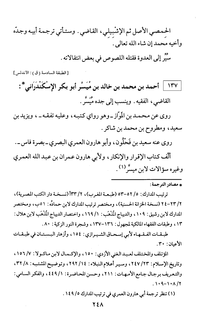 * مصادر الترجمة: ترتيب المدارك: 5/ 52 - 53 (طبعة المغرب)، 2/ 33 أ (نسخة دار الكتب المصرية)، 2/ 23 - 24 (نسخة الخزانة الحسنية)، ومختصر ترتيب المدارك لابن حماده: 51 ب، ومختصر المدارك لابن رشيق: 109، والديباج المذهب: 1/ 169، واختصار الديباج المذهب لابن هلال: 13، وطبقات الفقهاء المالكية لمجهول: 136 - 137، وشجرة النور الزكية: 80. طبقات الفقهاء لأبي إسحاق الشيرازي: 154، وأزهار البستان في طبقات الأعيان: 30. المؤتلف والمختلف لعبد الغني الأزدي: 150، والإكمال لابن ماكولا: 7/ 156، وتاريخ الإسلام: 23/ 247، وسير أعلام النبلاء: 14/ 292، وتوضيح المشتبه: 8/ 32، والتعريف برجال جامع الأمهات: 211، وحسن المحاضرة: 1/ 449، والفكر السامي: 2/ 108 - 109.