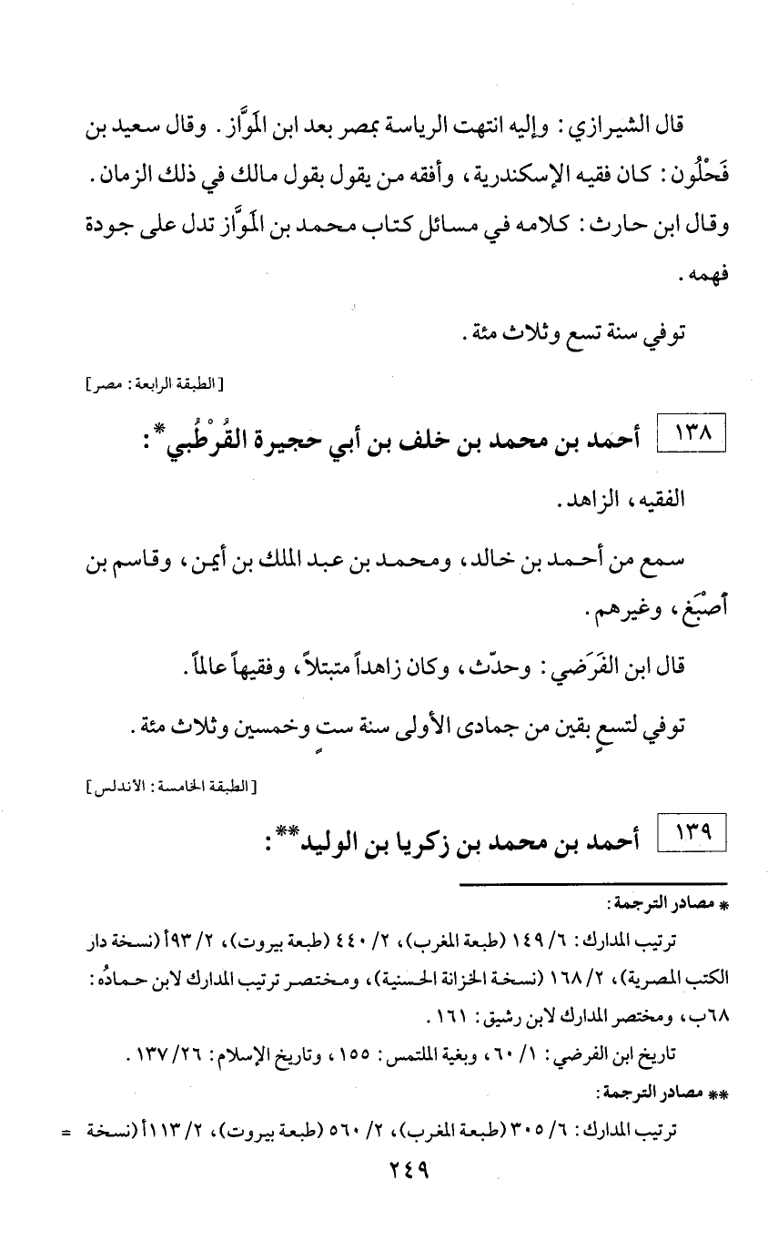 * مصادر الترجمة: ترتيب المدارك: 6/ 149 (طبعة المغرب)، 2/ 440 (طبعة بيروت)، 2/ 93 أ (نسخة دار الكتب المصرية)، 2/ 168 (نسخة الخزانة الحسنية)، ومختصر ترتيب المدارك لابن حماده: 68 ب، ومختصر المدارك لابن رشيق: 161. تاريخ ابن الفرضي: 1/ 60، وبغية الملتمس: 155، وتاريخ الإسلام: 26/ 137.