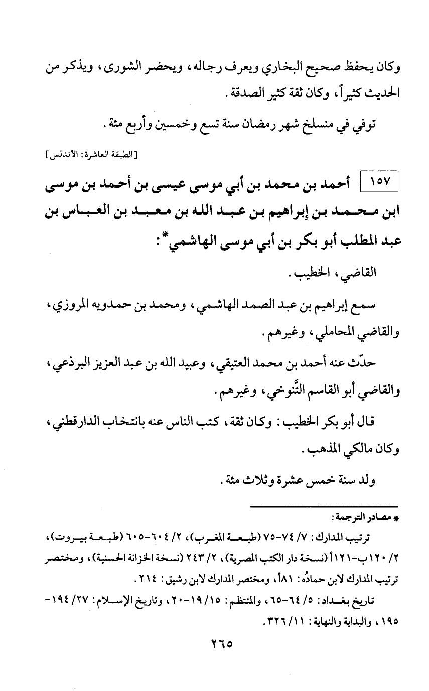* مصادر الترجمة: ترتيب المدارك: 7/ 74 - 75 (طبعة المغرب)، 2/ 604 - 605 (طبعة بيروت)، 2/ 120 ب - 121 أ (نسخة دار الكتب المصرية)، 2/ 243 (نسخة الخزانة الحسنية)، ومختصر ترتيب المدارك لابن حماده: 81 أ، ومختصر المدارك لابن رشيق: 214. تاريخ بغداد: 5/ 64 - 65، والمنتظم: 15/ 19 - 20، وتاريخ الإسلام: 27/ 194 - 195، والبداية والنهاية: 11/ 326.
