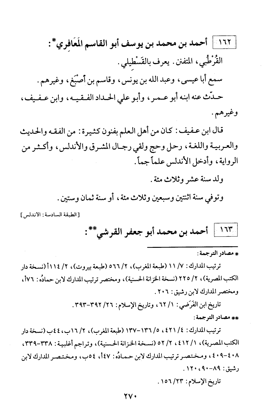 ** مصادر الترجمة: ترتيب المدارك: 4/ 421، 5/ 136 - 137 (طبعة المغرب)، 2/ 16 ب، 44 ب (نسخة دار الكتب المصرية)، 1/ 412، 2/ 225 (نسخة الخزانة الحسنية)، وتراجم أغلبية: 338 - 339، 408 - 409، ومختصر ترتيب المدارك لابن حماده: 47 أ، 54 ب، ومختصر المدارك لابن رشيق: 89 - 90، 120. تاريخ الإسلام: 23/ 156.