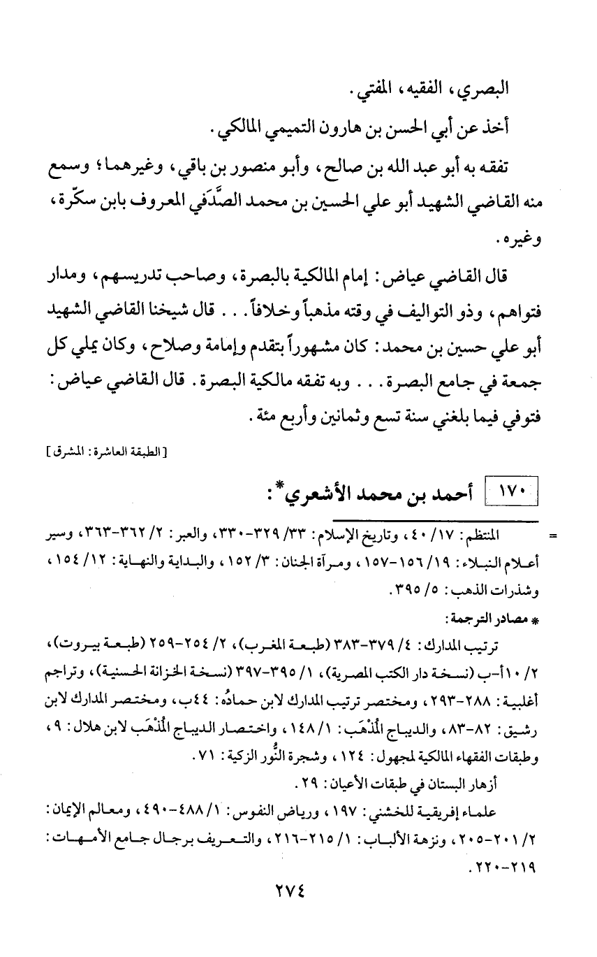 قال القاضي عياض: إمام المالكية بالبصرة، وصاحب تدريسهم، ومدار فتواهم، وذو التواليف في وقته مذهبا وخلافا. . . قال شيخنا القاضي الشهيد أبو علي حسين بن محمد: كان مشهورا بتقدم وإمامة وصلاح، وكان يملي كل جمعة في جامع البصرة. . . وبه تفقه مالكية البصرة. قال القاضي عياض: فتوفي فيما بلغني سنة تسع وثمانين وأربع مئة.