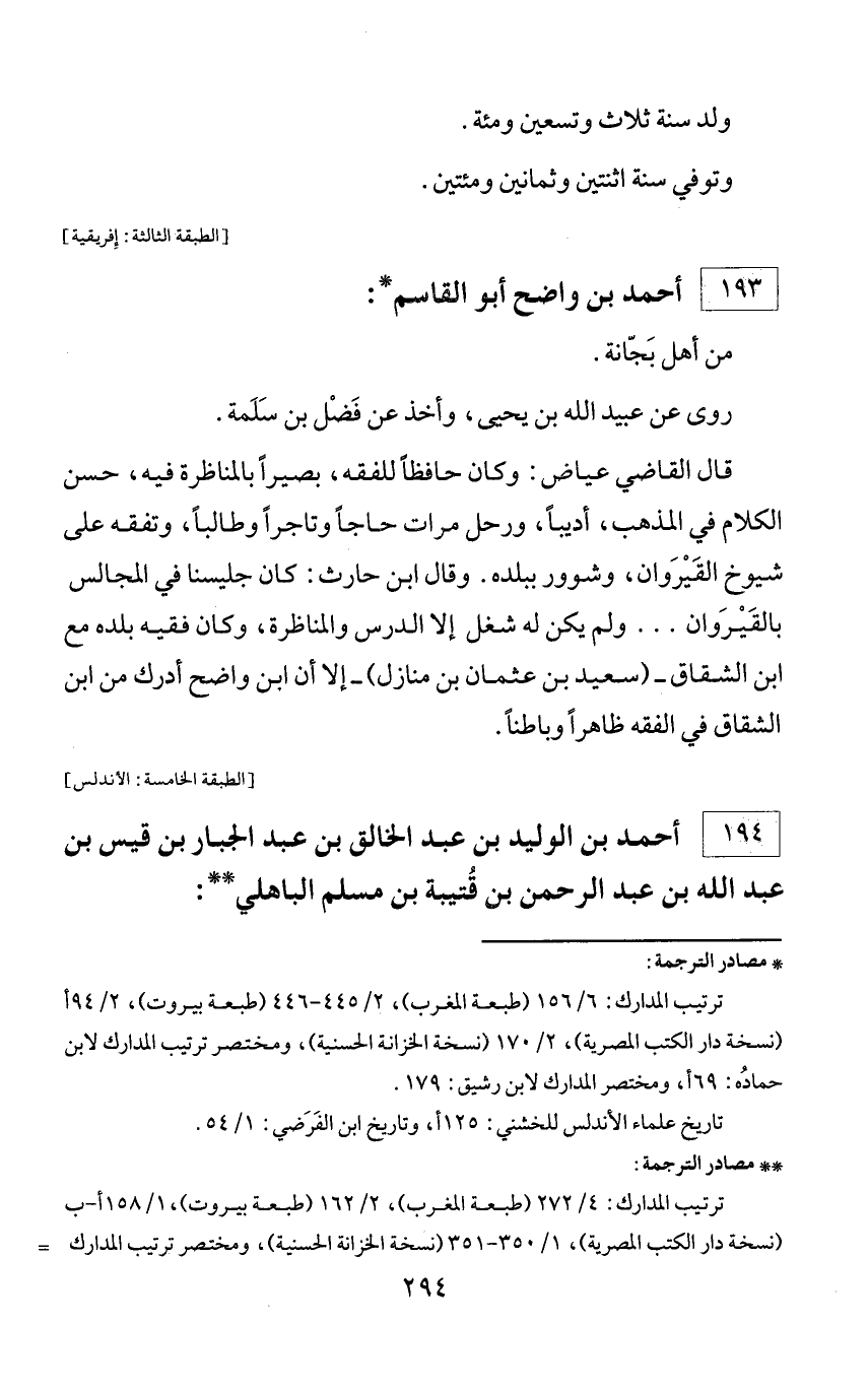 * مصادر الترجمة: ترتيب المدارك: 6/ 156 (طبعة المغرب)، 2/ 445 - 446 (طبعة بيروت)، 2/ 94 أ (نسخة دار الكتب المصرية)، 2/ 170 (نسخة الخزانة الحسنية)، ومختصر ترتيب المدارك لابن حماده: 69 أ، ومختصر المدارك لابن رشيق: 179. تاريخ علماء الأندلس للخشني: 125 أ، وتاريخ ابن الفرضي: 1/ 54.