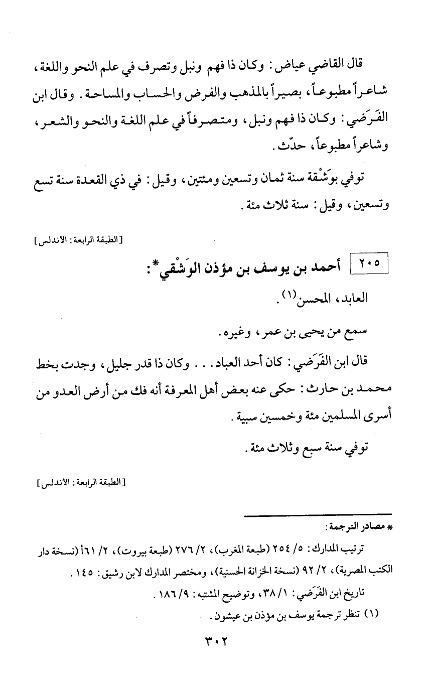 * مصادر الترجمة: ترتيب المدارك: 5/ 254 (طبعة المغرب)، 2/ 276 (طبعة بيروت)، 2/ 61 أ (نسخة دار الكتب المصرية)، 2/ 92 (نسخة الخزانة الحسنية)، ومختصر المدارك لابن رشيق: 145. تاريخ ابن الفرضي: 1/ 38، وتوضيح المشتبه: 9/ 186.
