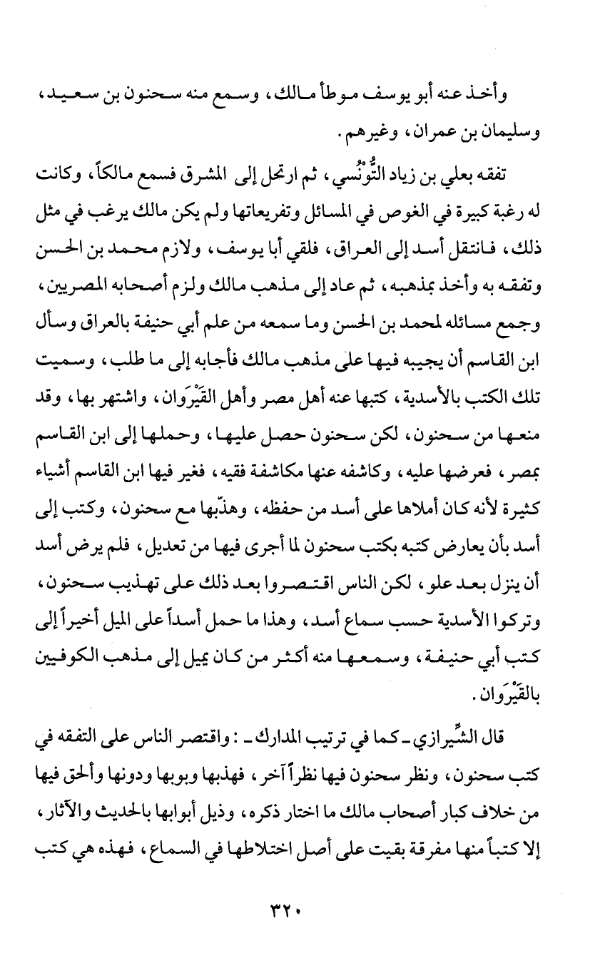 قال الشّيرازي - كما في ترتيب المدارك -: واقتصر الناس على التفقه في كتب سحنون، ونظر سحنون فيها نظرا آخر، فهذبها وبوبها ودونها وألحق فيها من خلاف كبار أصحاب مالك ما اختار ذكره، وذيل أبوابها بالحديث والآثار، إلا كتبا منها مفرقة بقيت على أصل اختلاطها في السماع، فهذه هي كتب